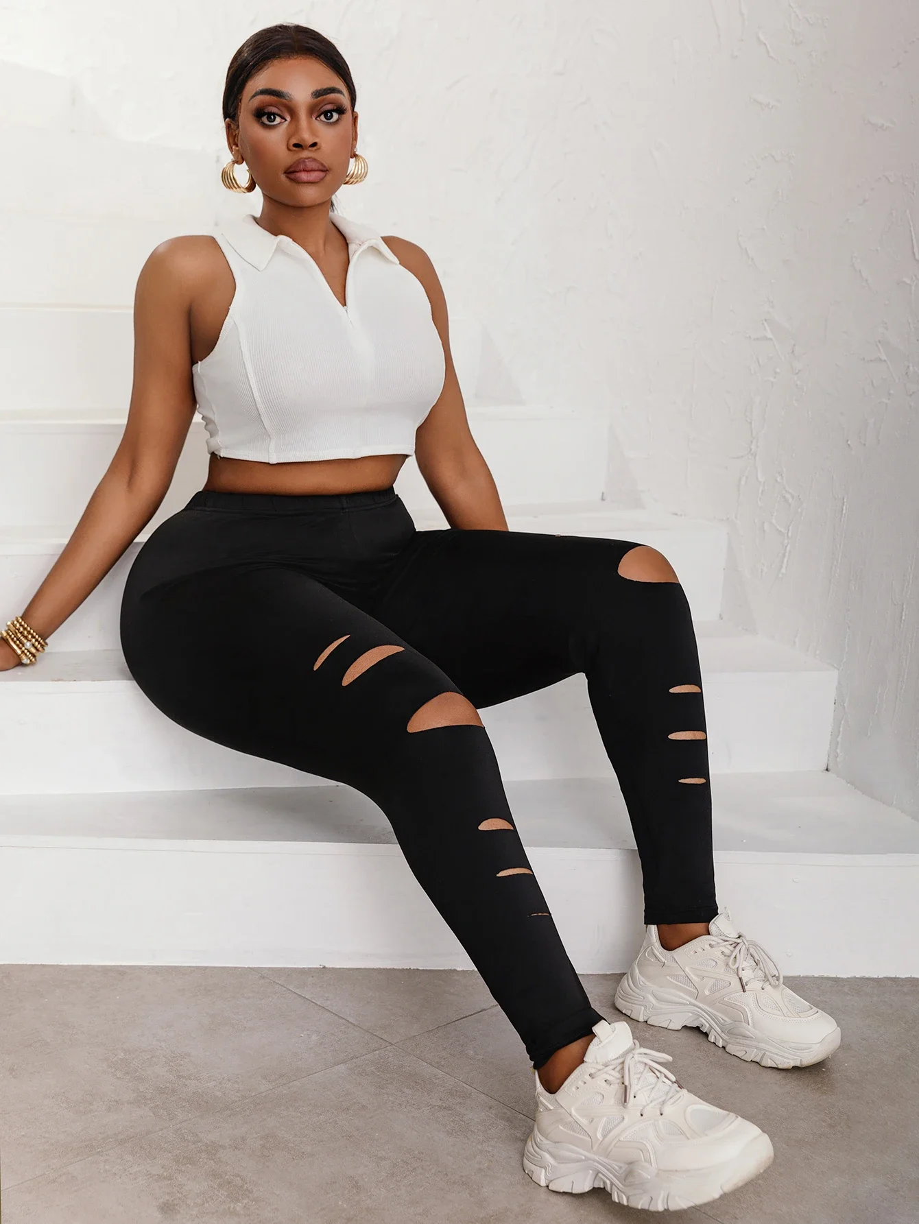 Plus Size Women’s Leggings Trendy Faux Cut-Out Stripe Design Comfortable High-Elasticity Knit Pants Solid Color Base Trousers