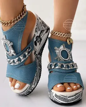 Sandals Women’s Newspaper Rhinestone Gear Pattern Slingback Platform Metal Thick Sole Women’s Shoes Heel Sandals Slippers