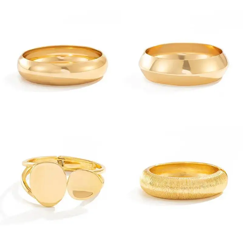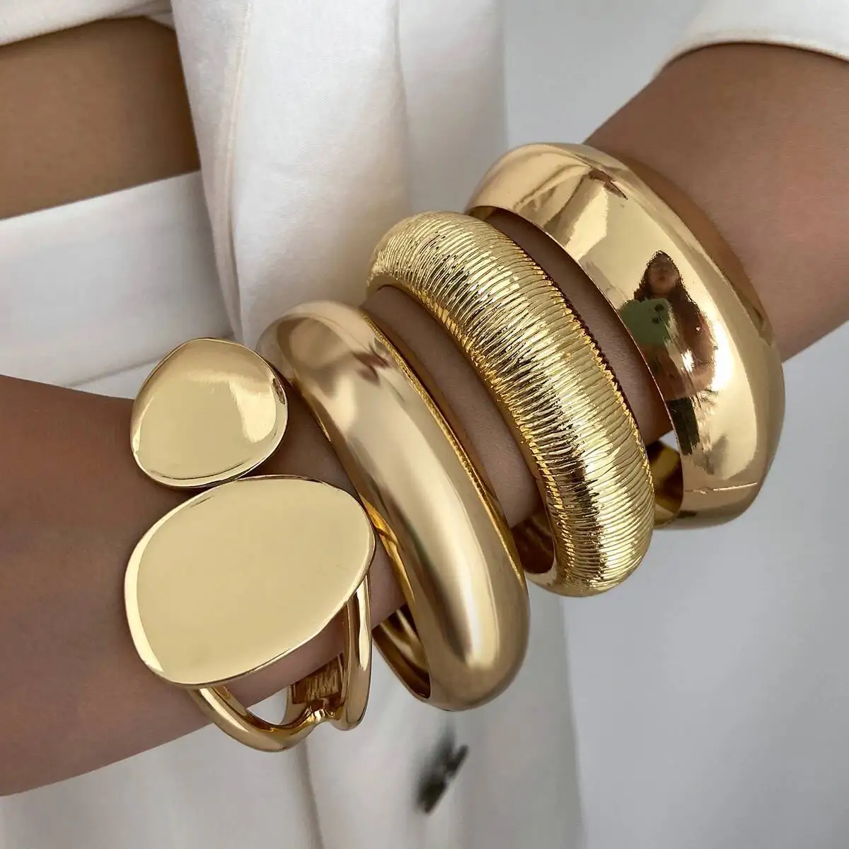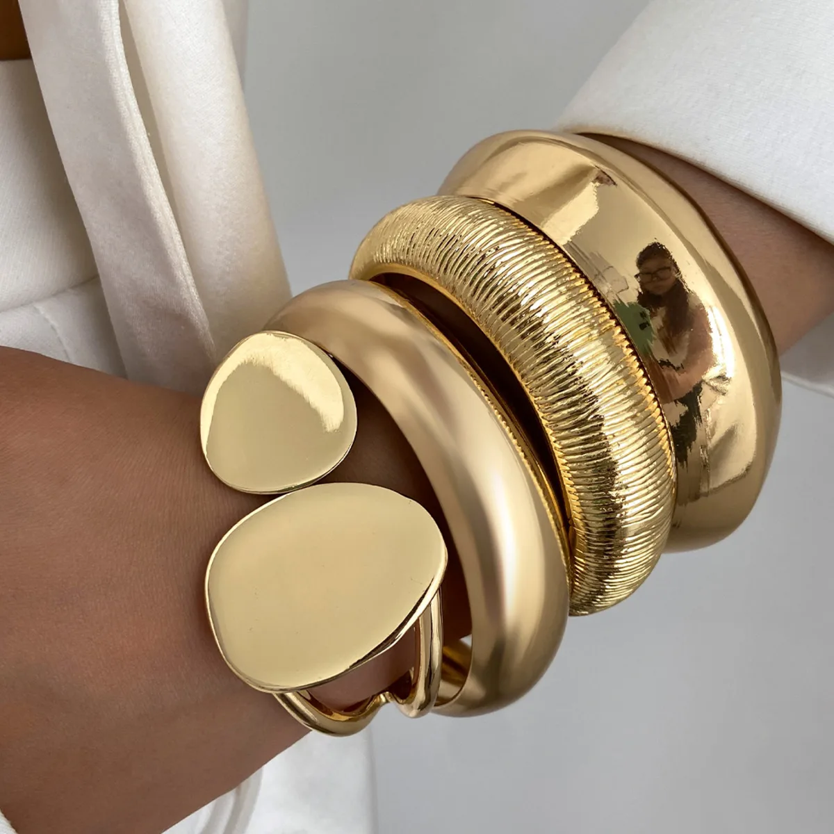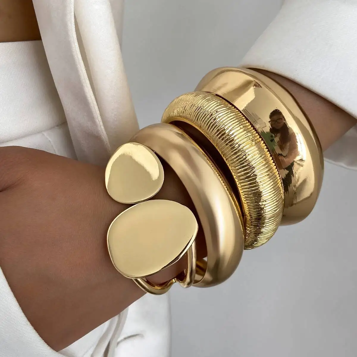 Salircon 4 Style Punk Exaggerated Wide Cuff Bangles Women Vintage Irregular Geometric Glossy Gold Color Spring Bracelets Jewelry