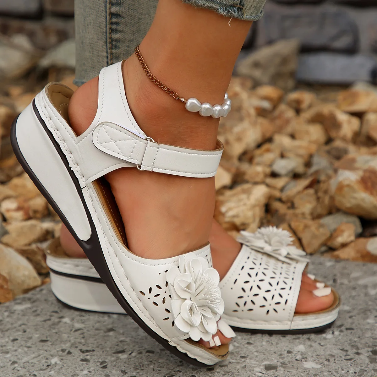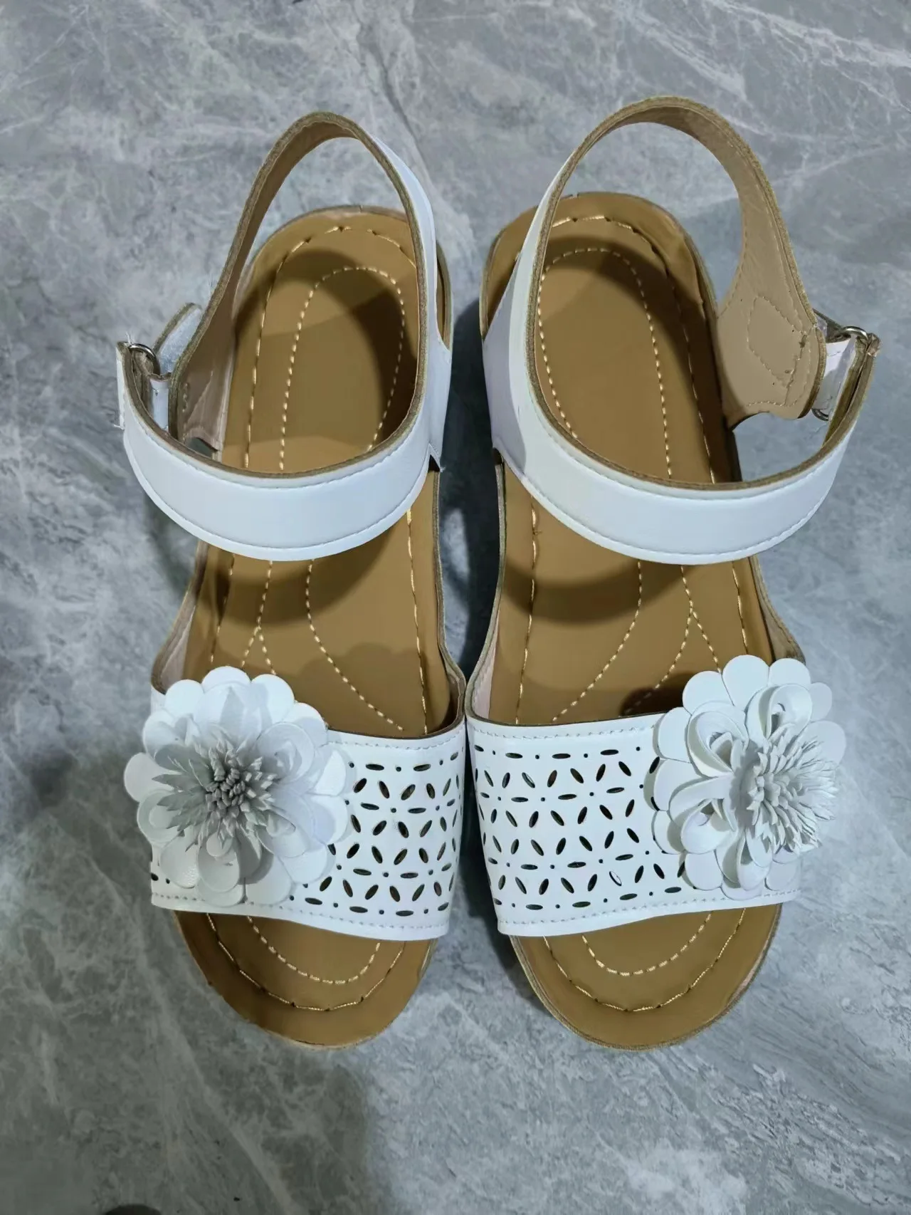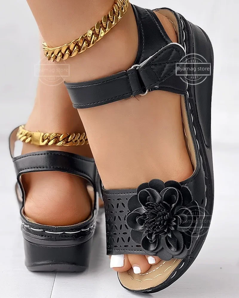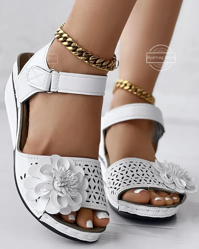 Sandals Women Hollow Out Floral Pattern Ankle Strap Wedge Thick Sole Floral Sandals Non Slip Lightweight Shoes Footwear