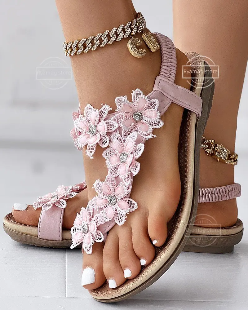 Sandals Women’s Floral Pattern Toe Ring Slingback Beach Sandals Flat Women Summer Shoes Bohemia Flowers Beach Ladies Shoes