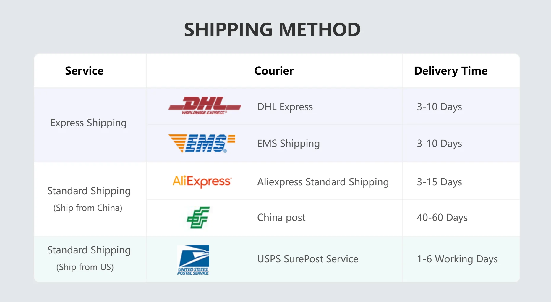 Packages from our warehouse in China will be shipped by ePacket or EMS depending on the weight and size of the product. Packages shipped from our US warehouse are shipped through USPS.