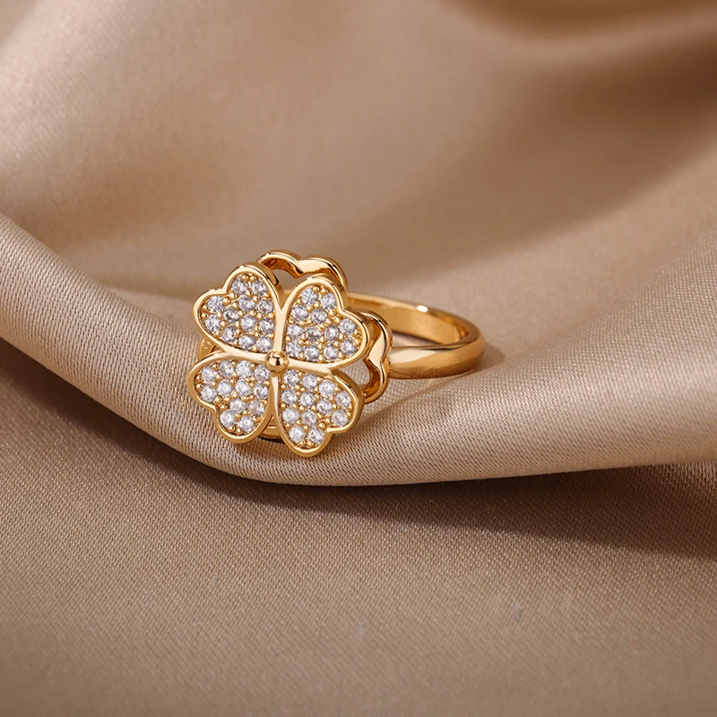 Spinner Zircon Heart Four Leaf Clover Rings For Women Stainless Steel Anti Stress Anxiety Fidget Ring Jewelry Christmas Gift