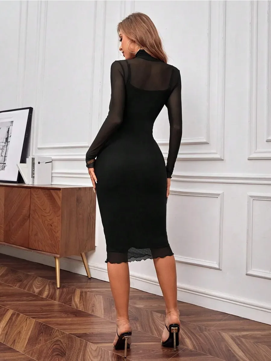 Spring And Autumn Fashion Sexy Night Club Perspective Mesh Dress Women’s Bodycon Turtleneck Long Sleeve Party Club Evening Dress