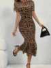 Spring Summer Fashion European Style Leopard Print round Neck Short Sleeve Fish Tail Hem Long Dress