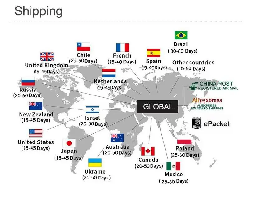 Packages from our warehouse in China will be shipped by ePacket or EMS depending on the weight and size of the product. Packages shipped from our US warehouse are shipped through USPS.