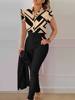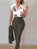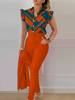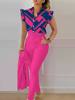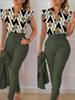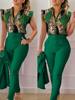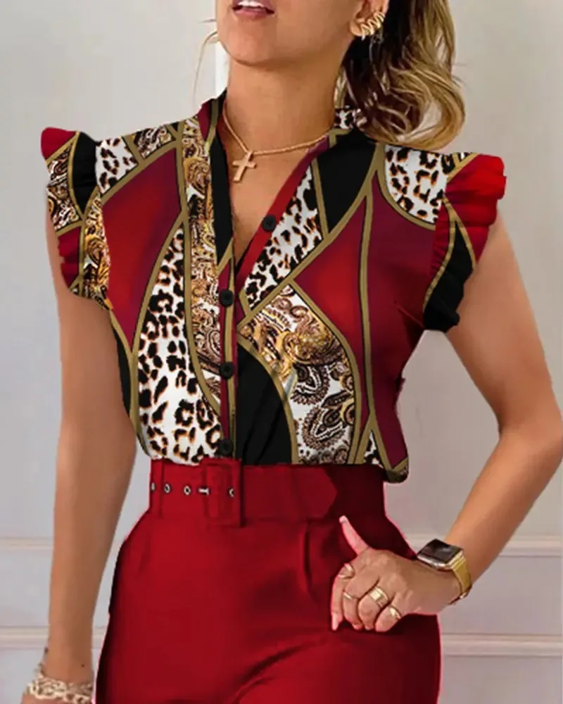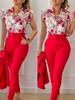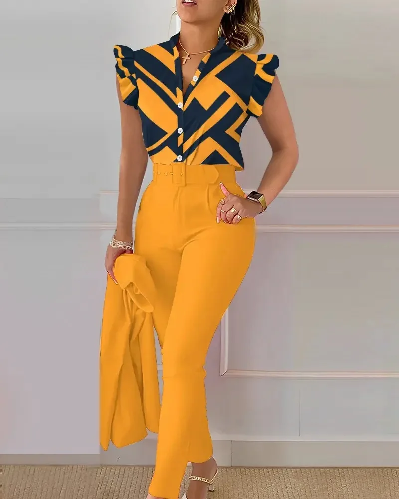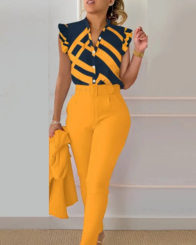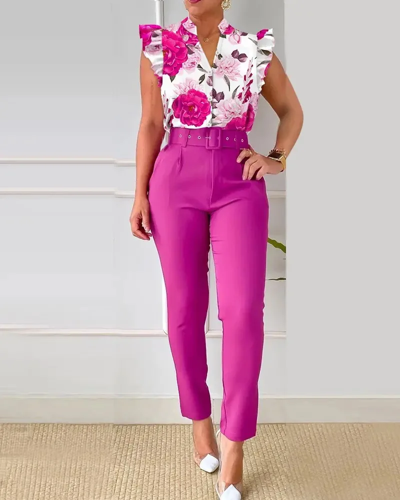 Spring Summer Women’s New Printed Lotus Leaf Sleeveless Shirt Suit Slim Femal Office Solid Color Long Pants Belt Two Piece Set