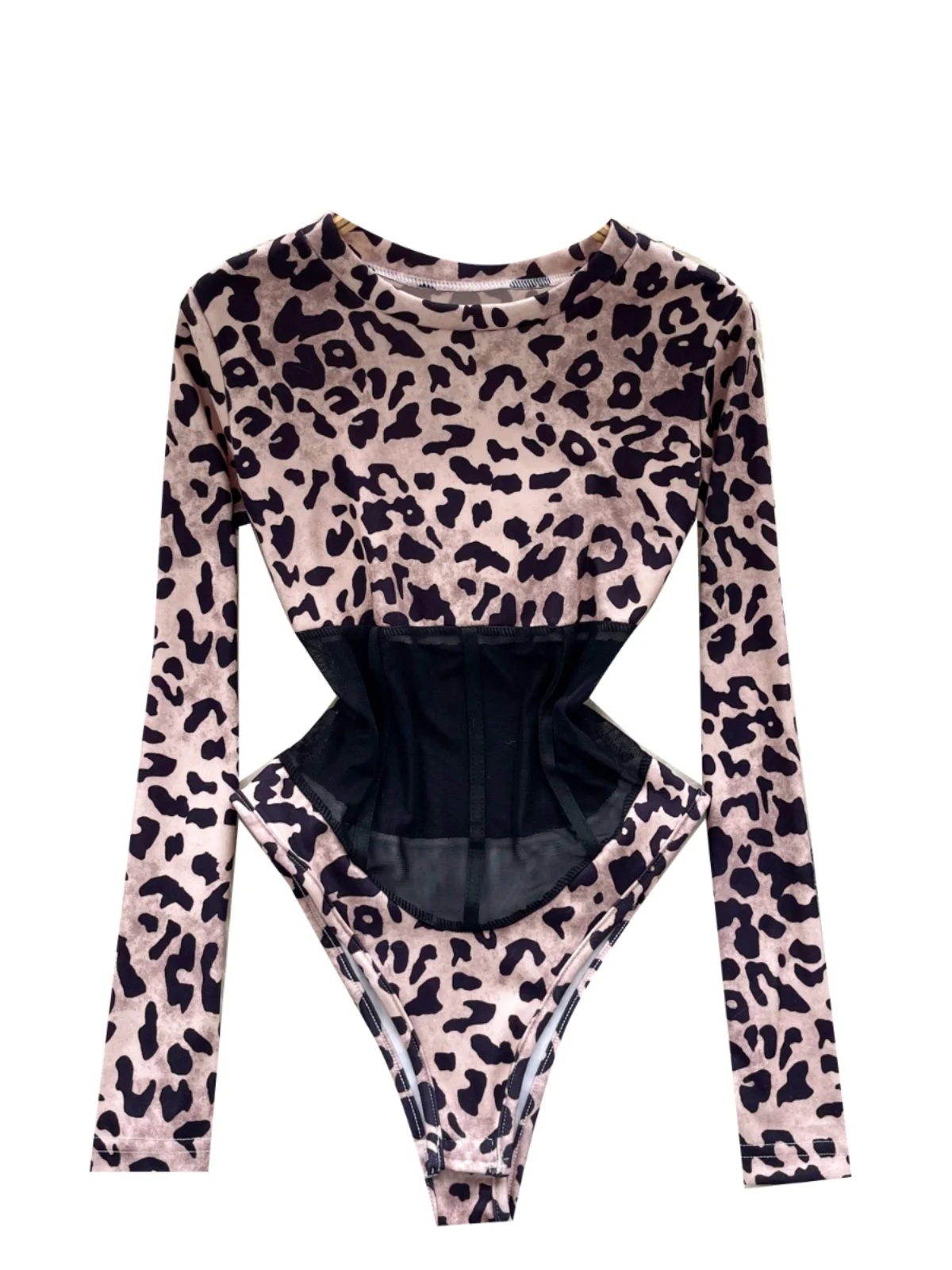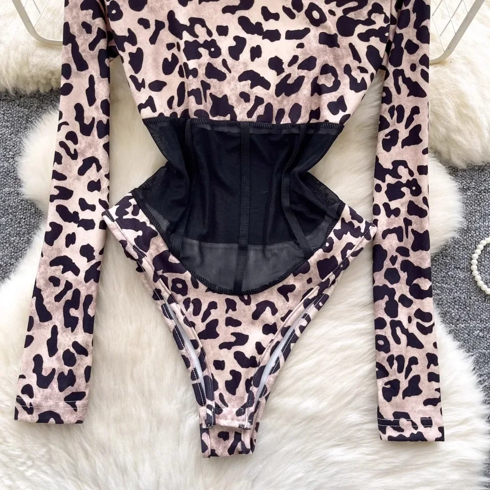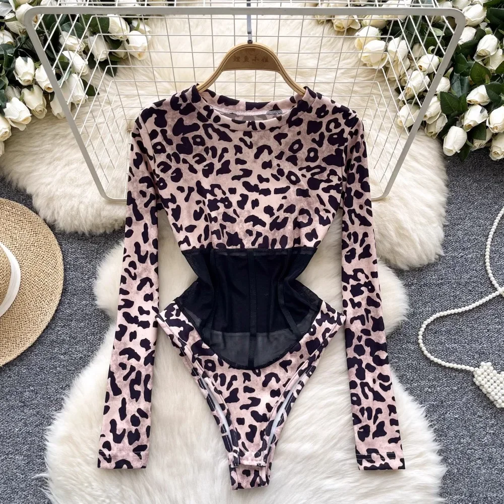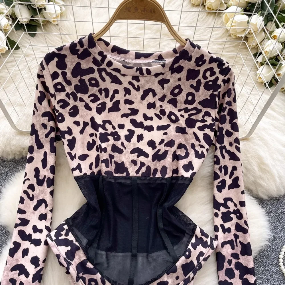 ssTss Long Sleeve Leopard Print Jumpsuit Women’s Sexy Perspective Mesh Stitching Slim Fit T-shirt Girls Bottom Bodysuit Tees
