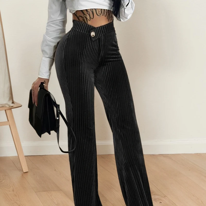 Streetwear Corduroy Straight Wide Leg Trousers Fashion Versatile Slim Fitting Stripe Zipper Fly V-low Waist Trousers For Women