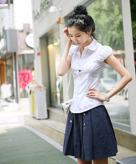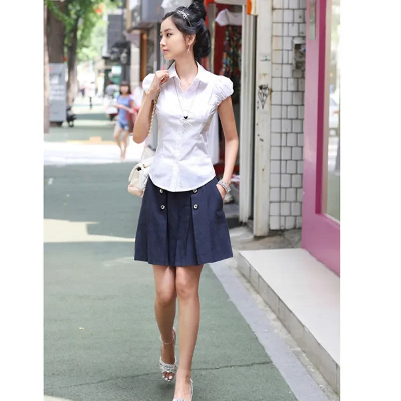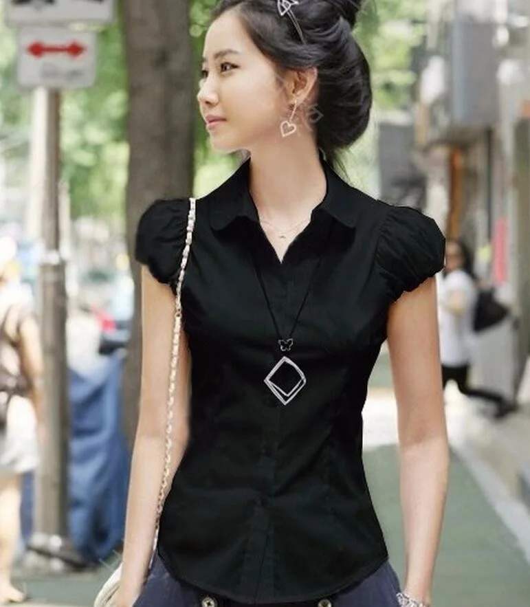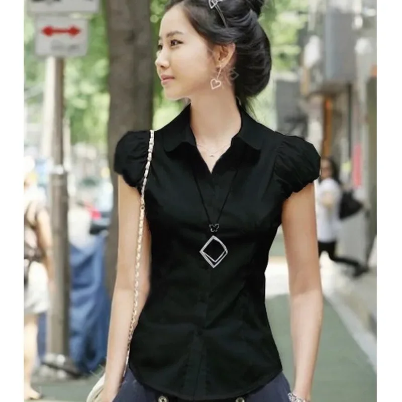Summer New Women Short Puff Sleeve Turn-down Collar Summer Casual Chiffon Blouses Tops Pockets Shirt Slim Blouse Shirts