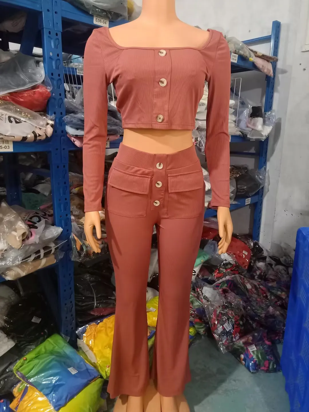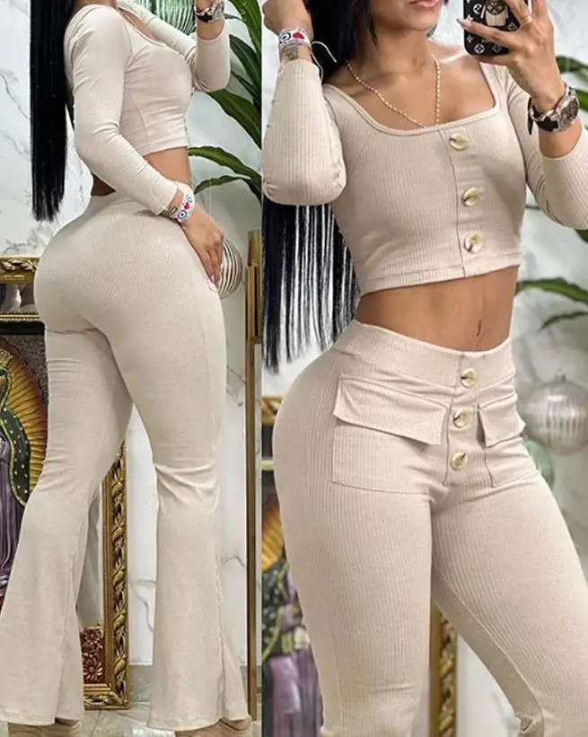 Two Piece Set Women Outfit 2023 Summer Fashion Square Neck Long Sleeve Buttoned Top & Pocket Design High Waist Flared Pants Set