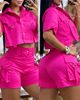 Two Piece Set Women Outfit 2025 Summer Turn-Down Collar Flap Detail Buttoned Crop Top Casual Pocket Design Sport Shorts Set