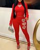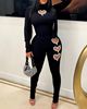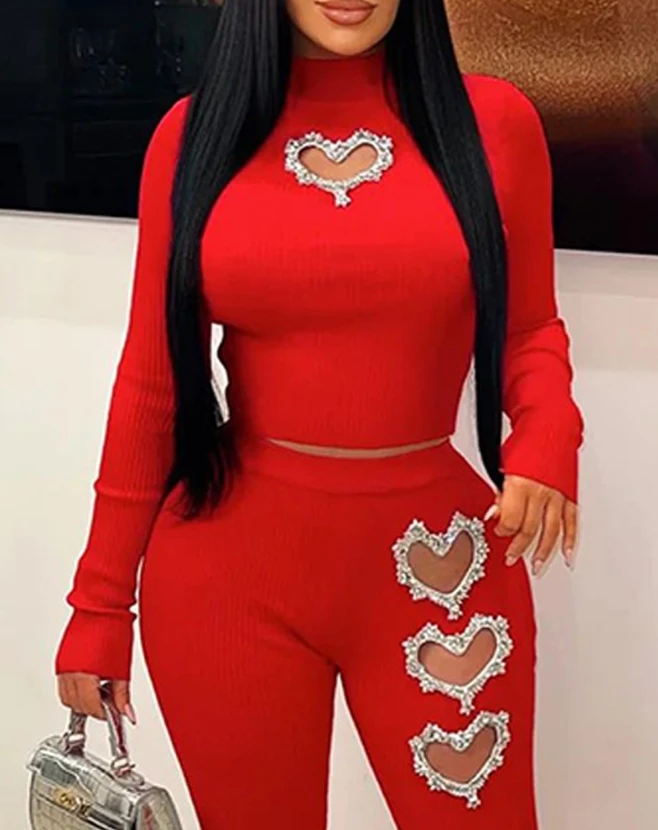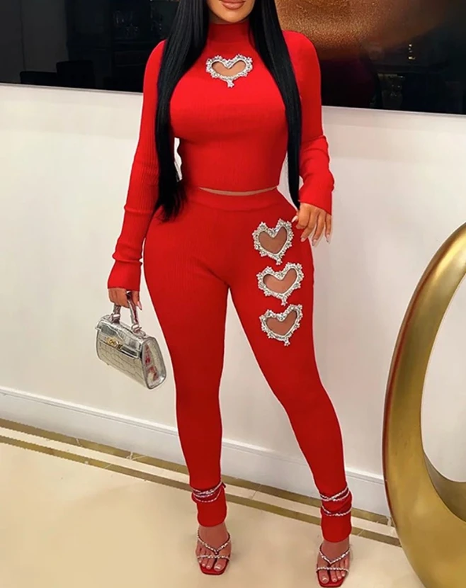 Two Piece Set Women Outfit Spring Fashion Hollow Heart Rhinestone Mock Neck Long Sleeve Top & Casual High Waist Skinny Pants Set