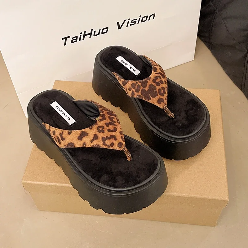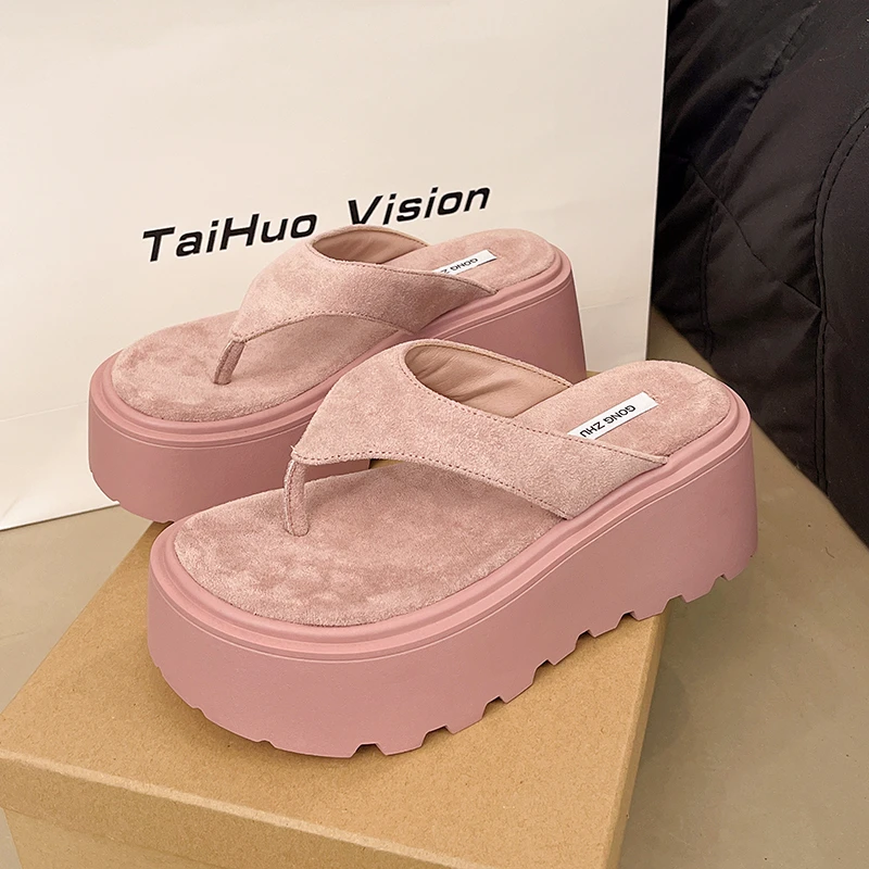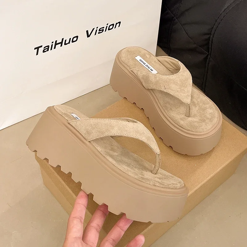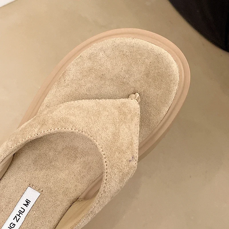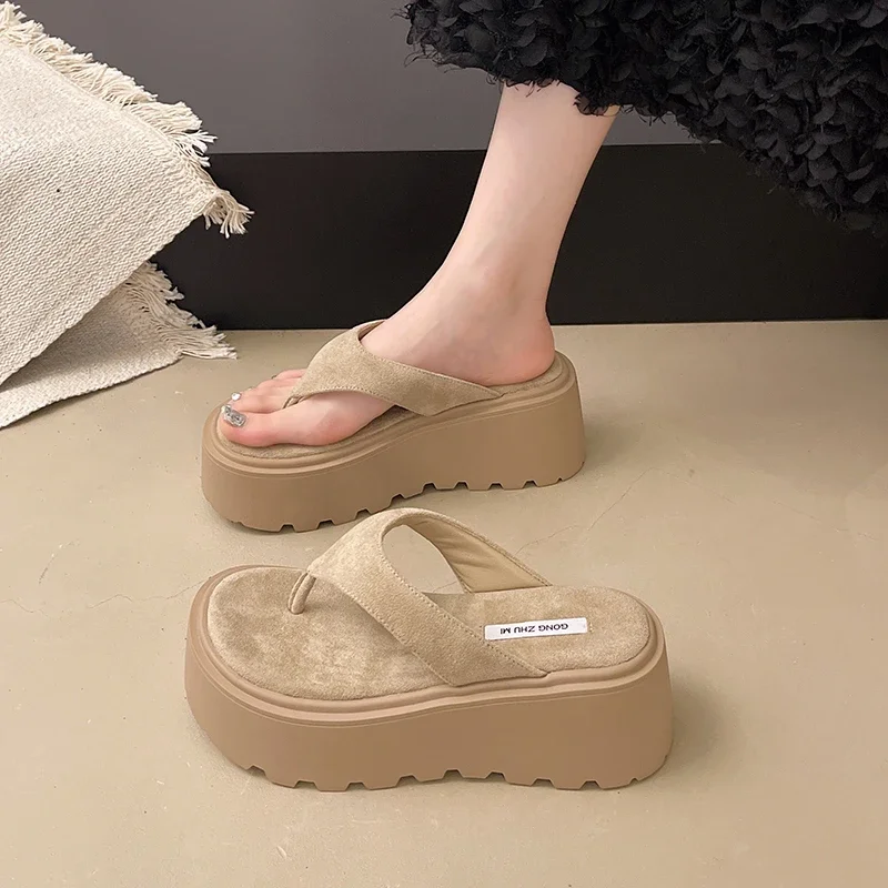 Wedge Outdoor Slippers Women’s Summer Thick Bottom Flip Flops Outdoor High Waist Seaside Beach Leisure Flip Flops Suede