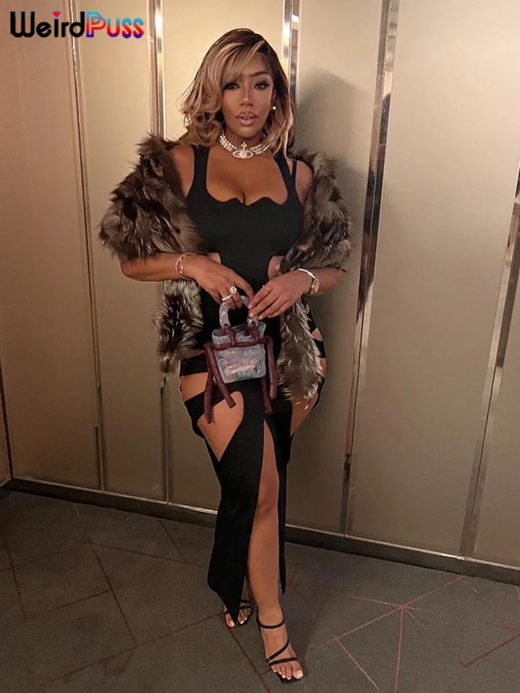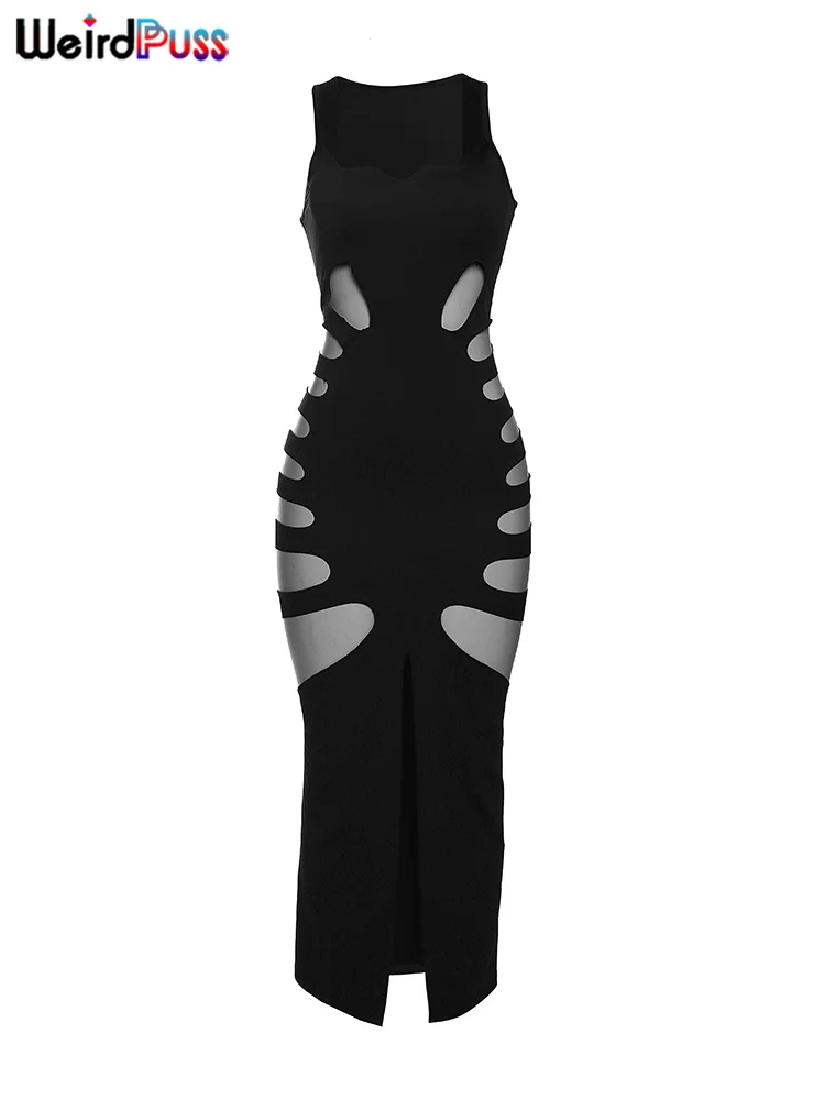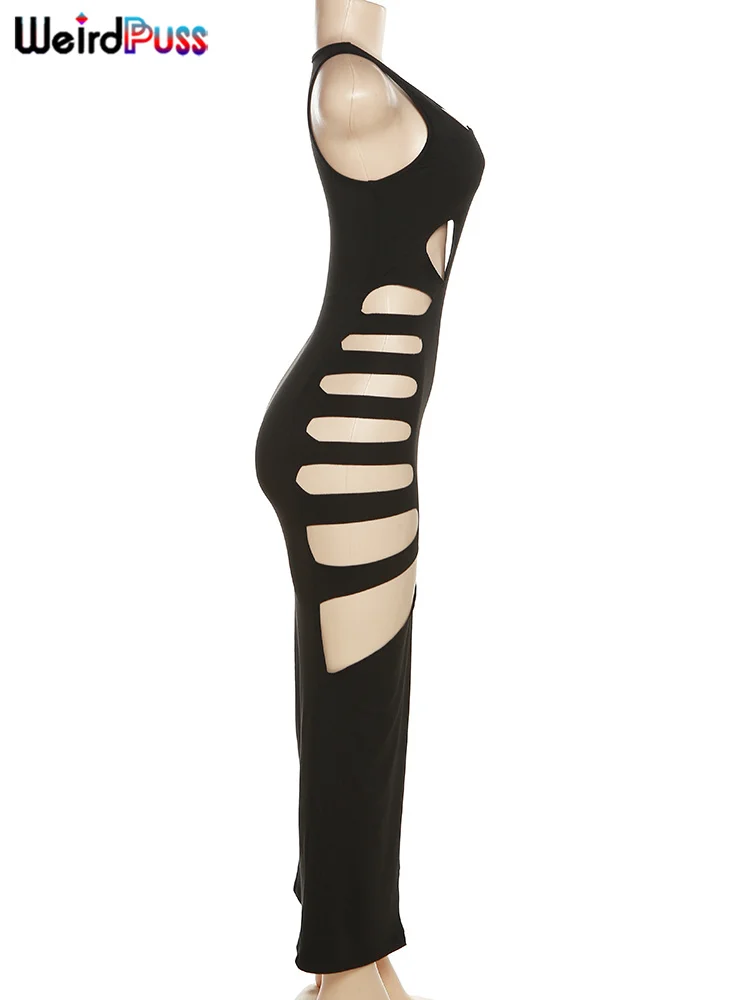 Weird Puss Hollow Sexy Dress Women Summer New Sleeveless Split Solid Skinny Stretch Maxi Bodycon Clubwear Coquette Slim Vestidos