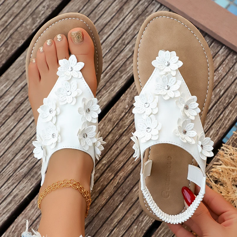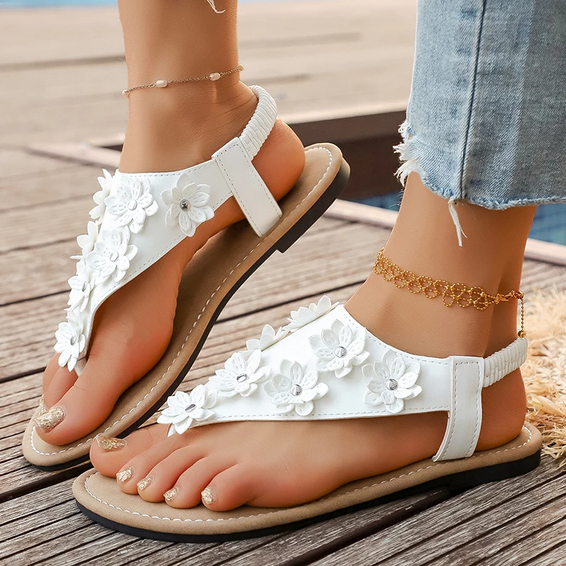 White Flower Decor Flat Sandals Women 2026 Summer Non-slip Beach Flip Flops Woman Plus Size 43 Bohemian Style Thong Sandals
