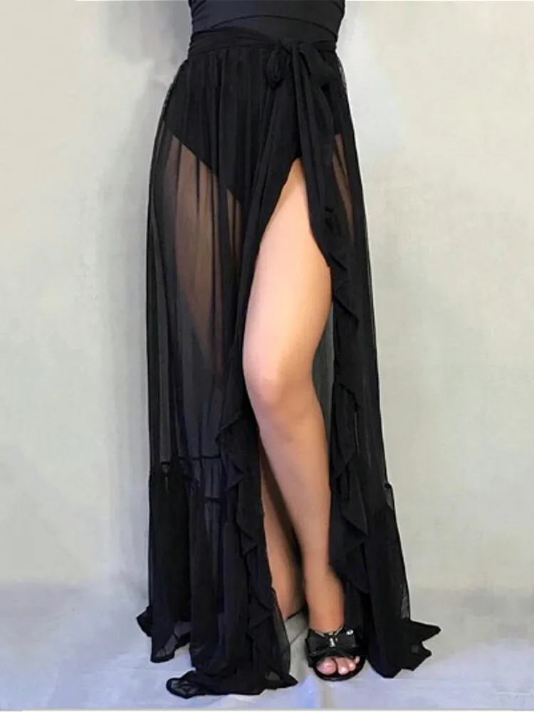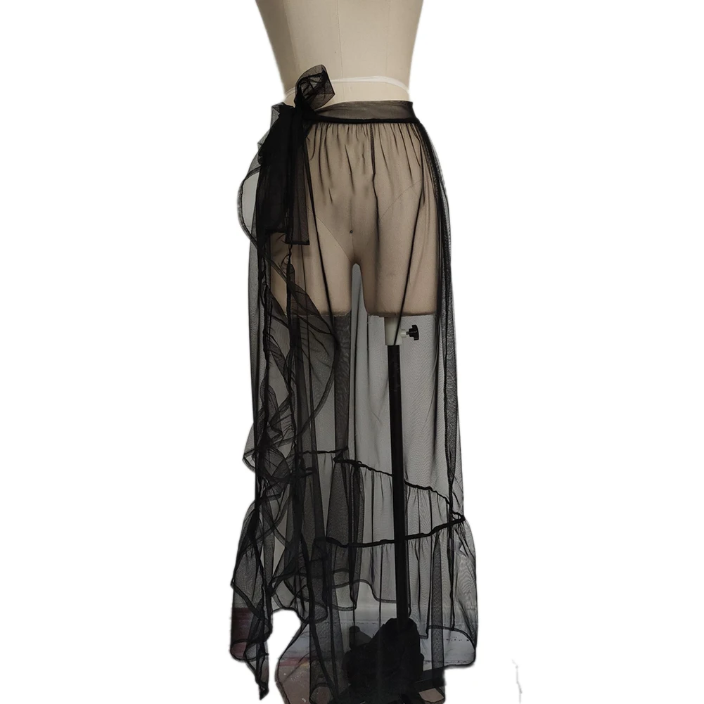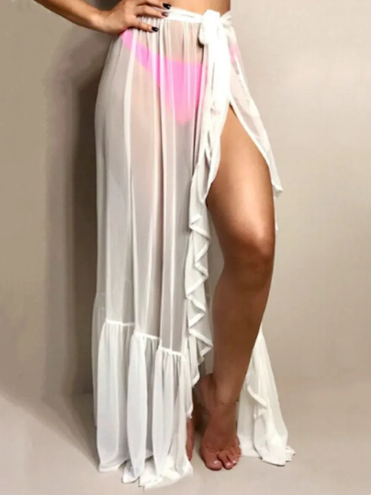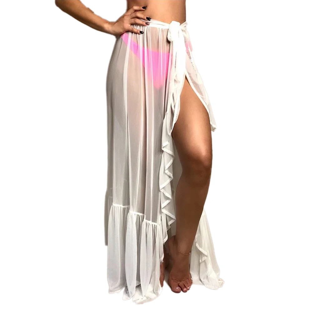 Women Bikini Cover Up Skirt, See-through Wave Point/Solid Color Lace-up Cover-Ups, Summer Sexy Ruffles Bathing Skirt