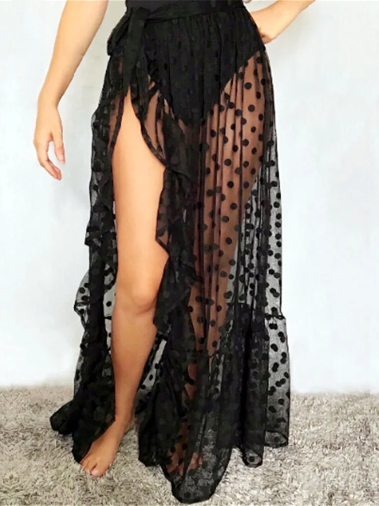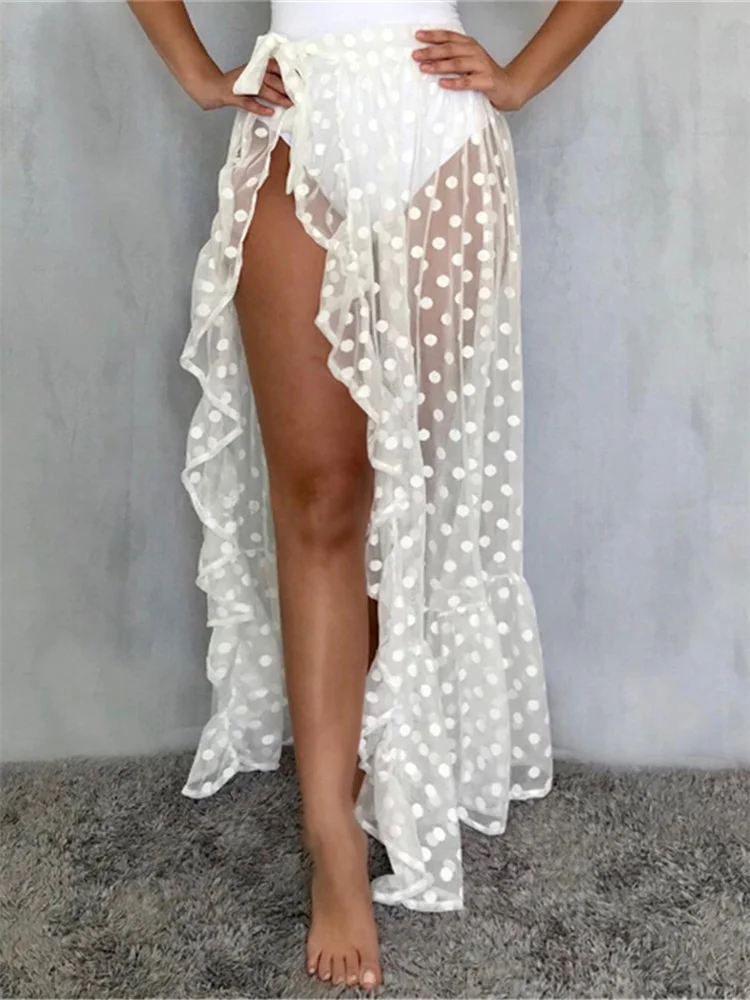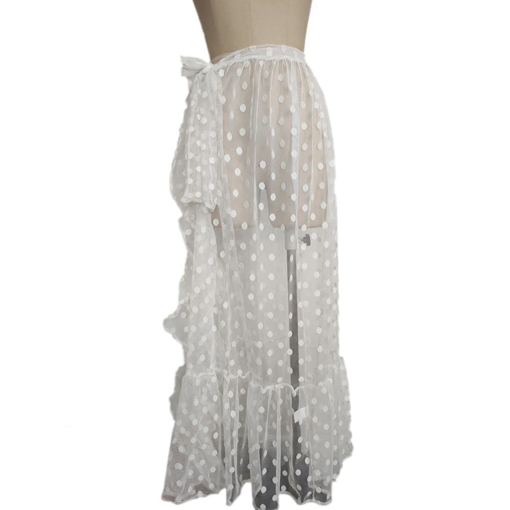 Women Bikini Cover Up Skirt See-through Wave Point/Solid Color Lace-up Cover-Ups Summer Sexy Ruffles Bathing Skirt