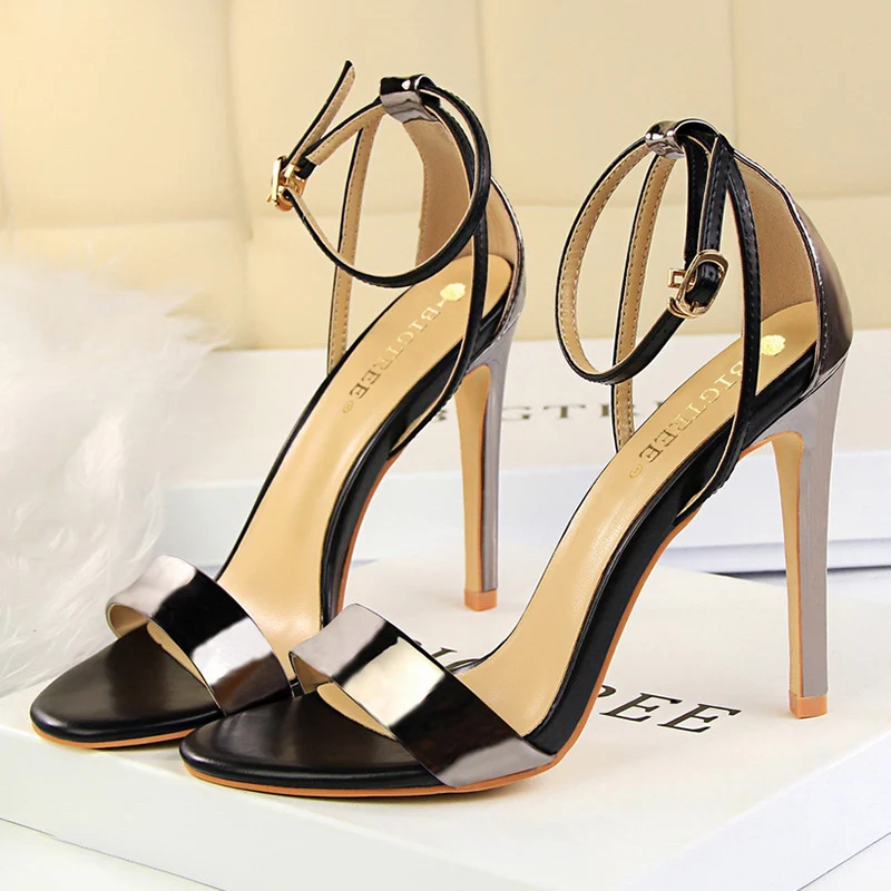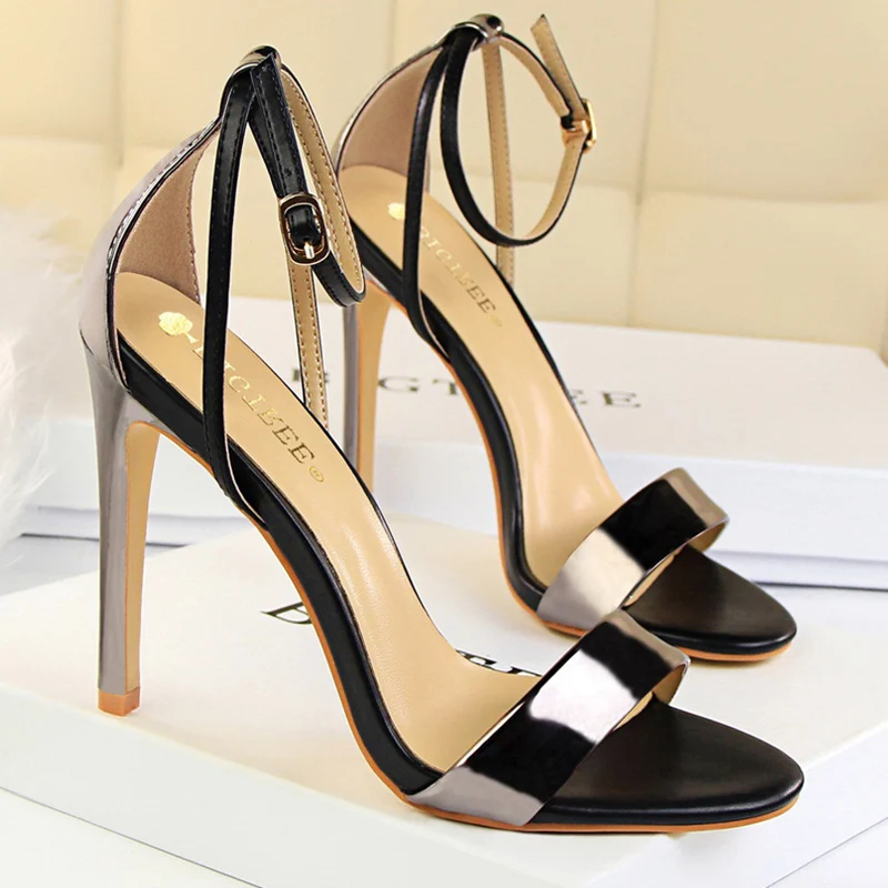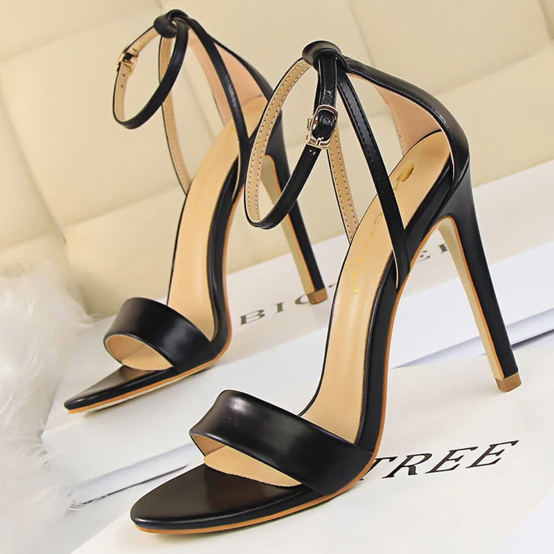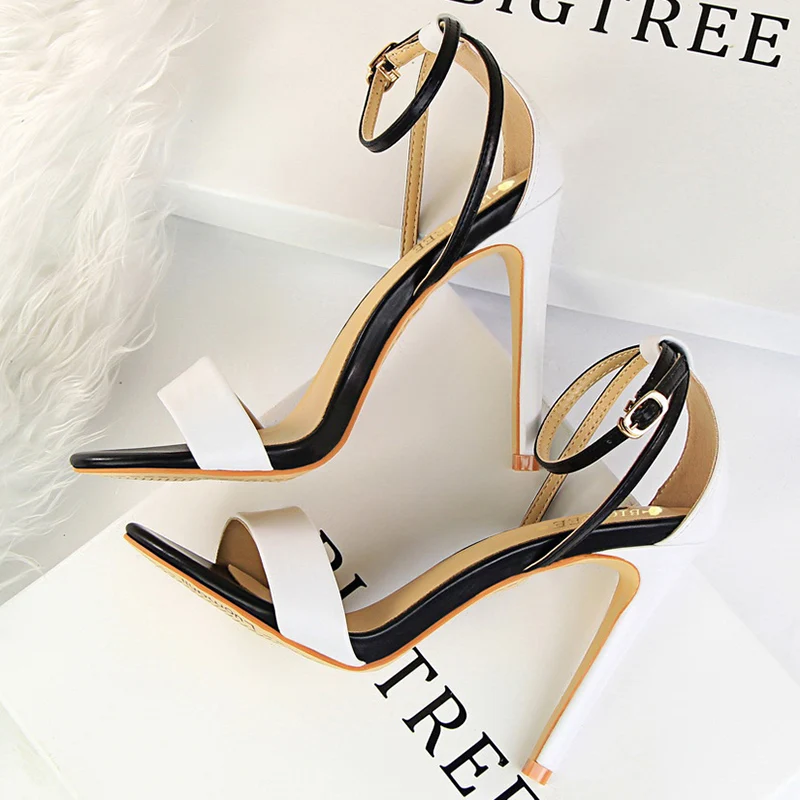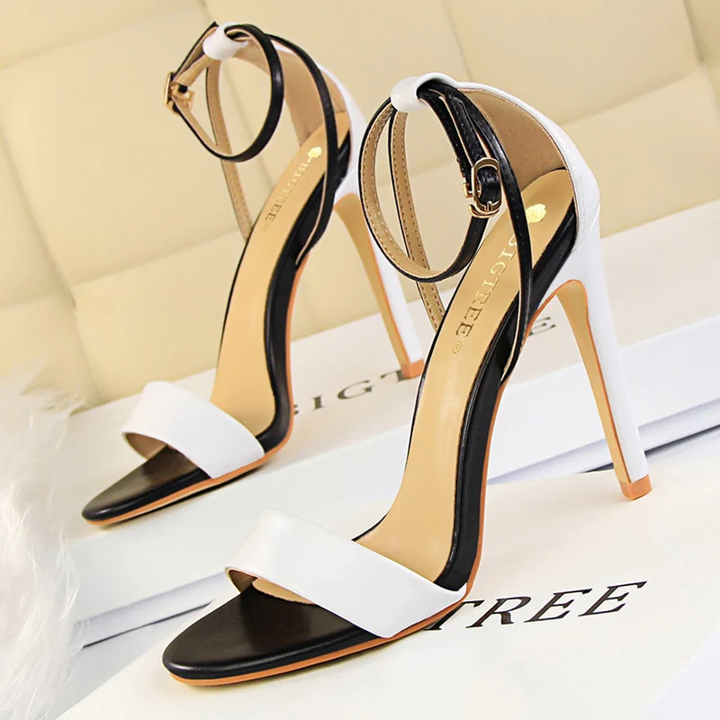 Women Black-White Concise Leather 11cm High Heels Sandals Lady Adjustable Ankle Buckle Shoes Female Fashion Party Dress Shoes