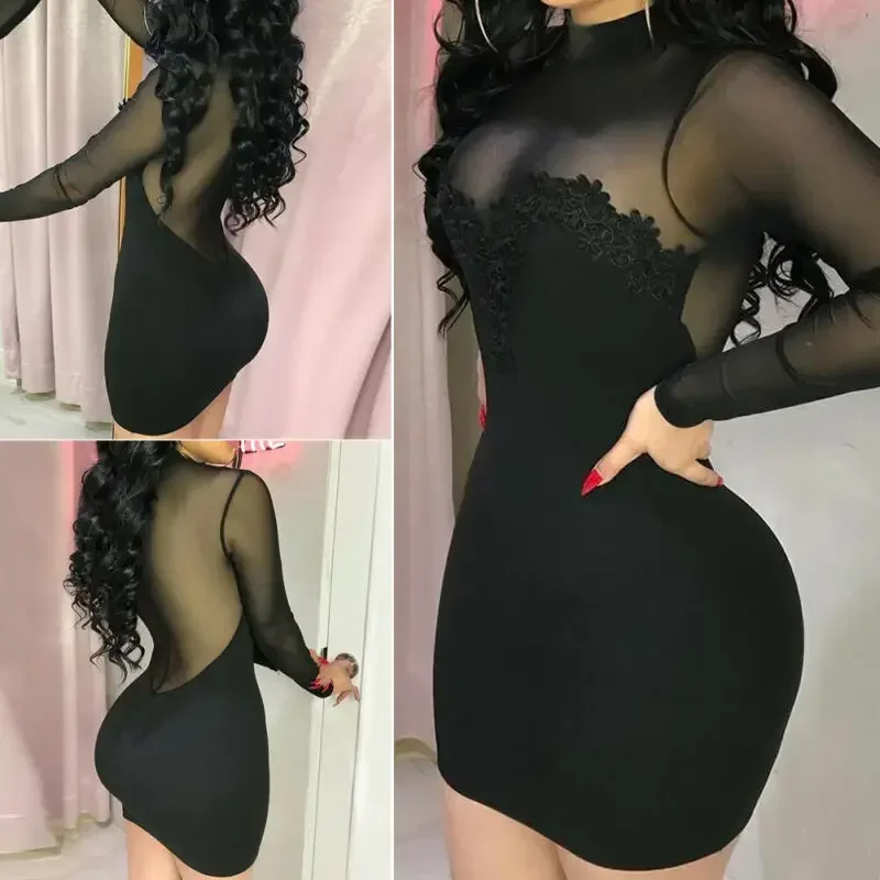Women Hip Dress, Solid Color Lace Mock Neck Long Sleeve, See Through Mesh Slim Dress for Cocktail Parties, Bars, Night Clubs