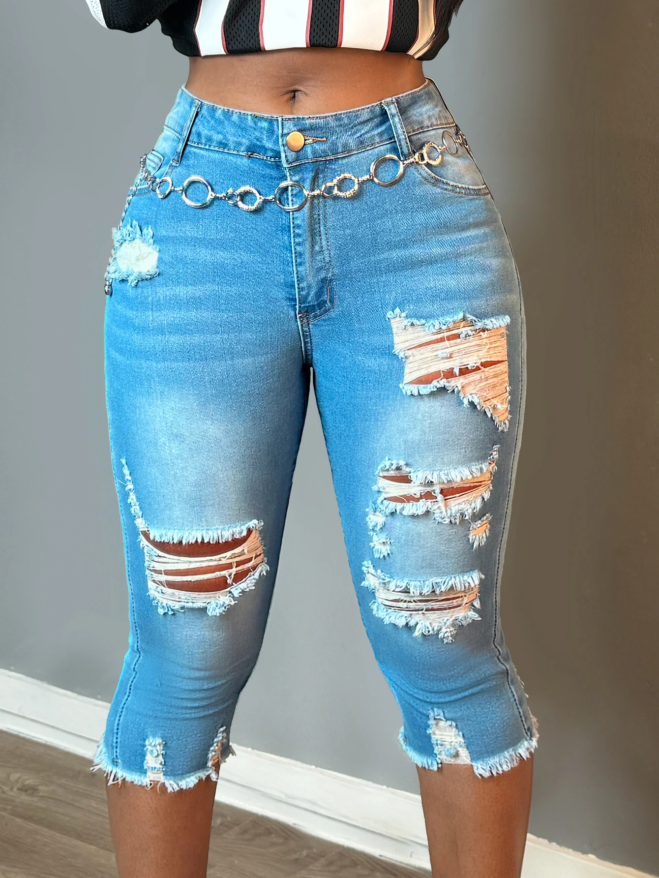 Women Fashion Casual Ripped Capri Jeans Slim-Fit Stretchy Jeans Classic Raw Hem Denim Calf-Length Pants