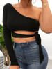 Women lady bandage slim tee tops long sleeve one-shoulder bow-tie elastic solid T Shirt cold shoulder sexy crop top Club Street