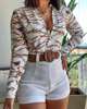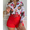 Women Long Sleeve Floral Printed Tie Knot Top Blouse and Shorts Sets Casual Spring Shirts Female