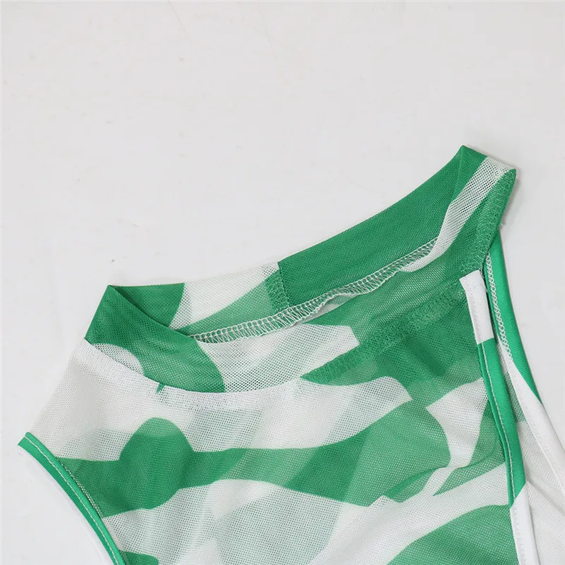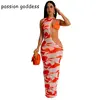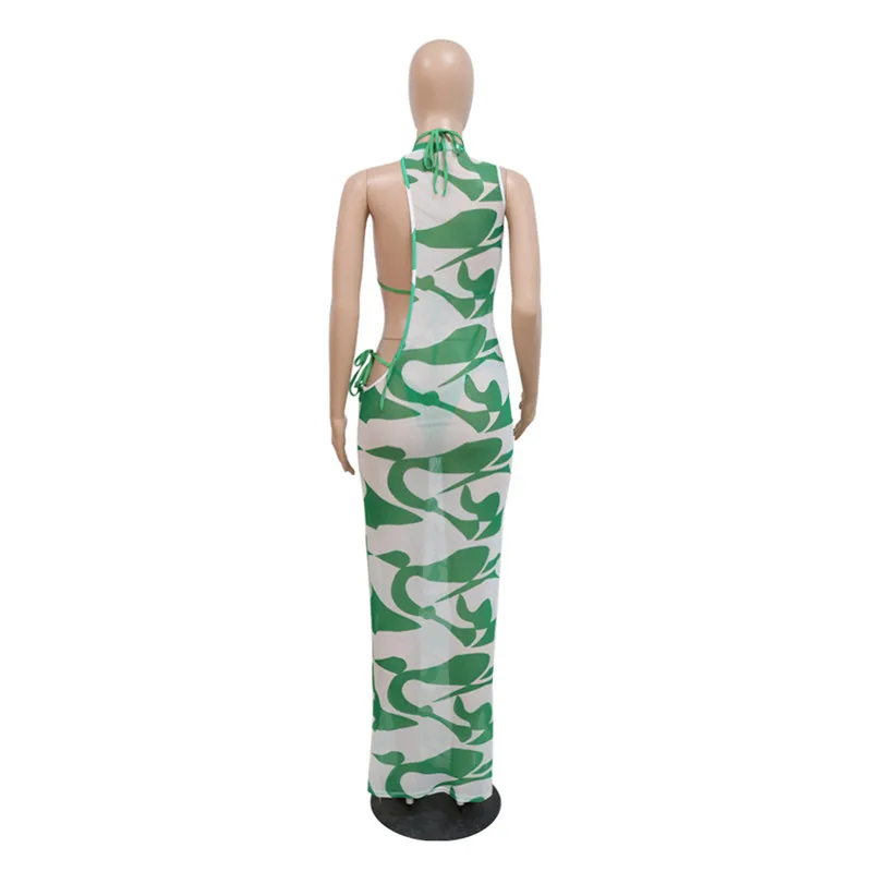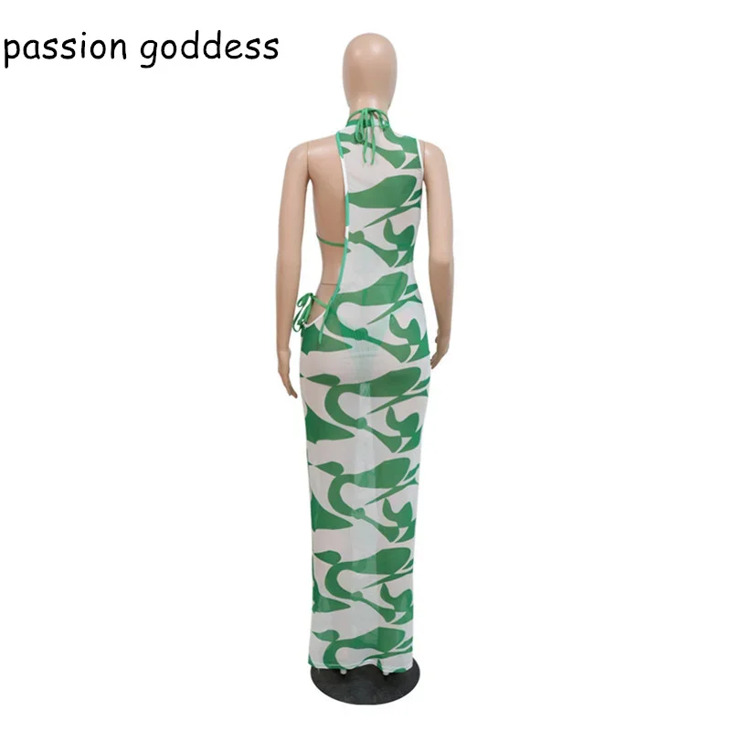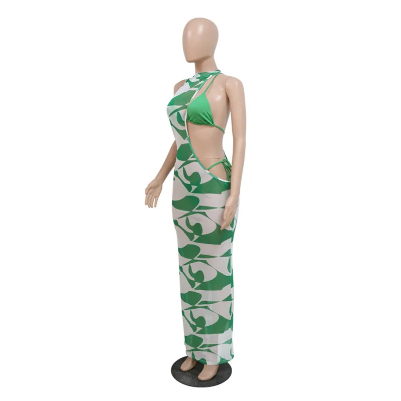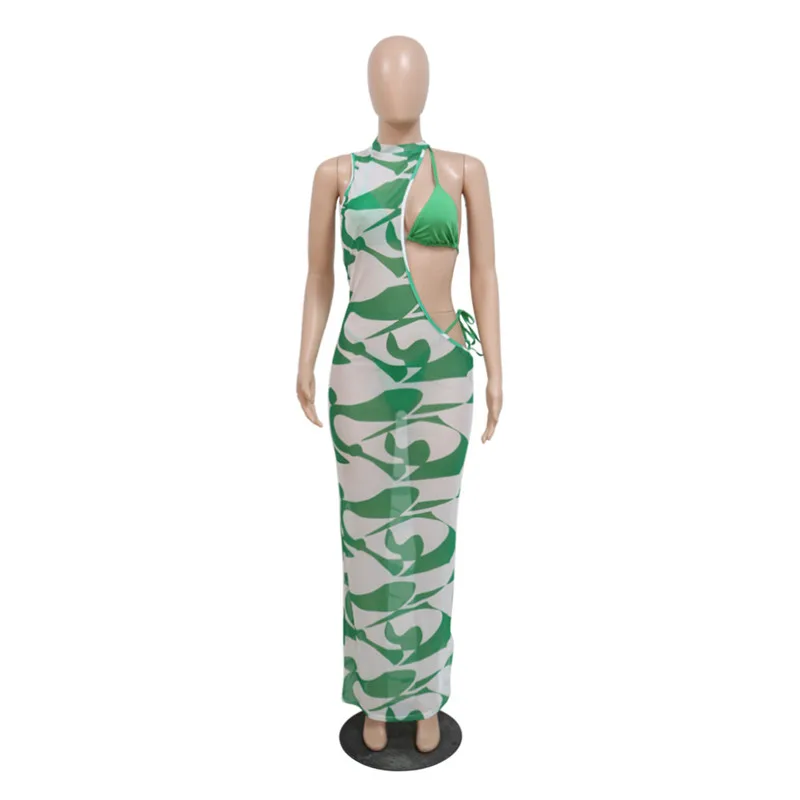 Women Sexy Bikini 3 Piece Sets Beach Style Lace Up Bra Top Low Waist Underpants Swimsuit Long Print Mesh Cutout Dress Cover Up