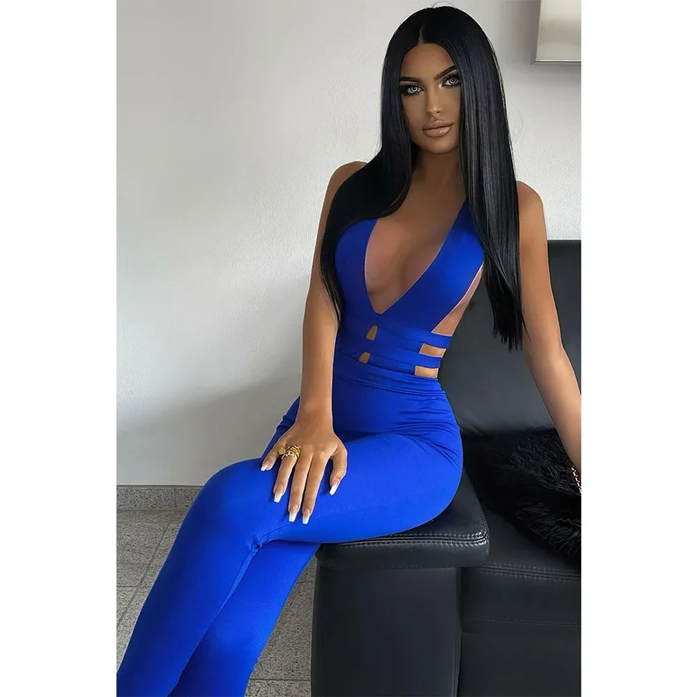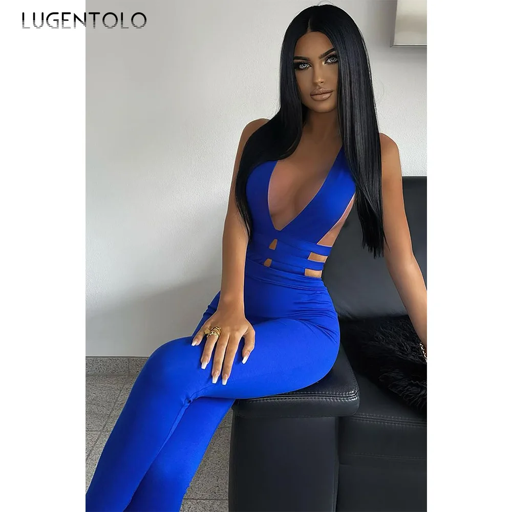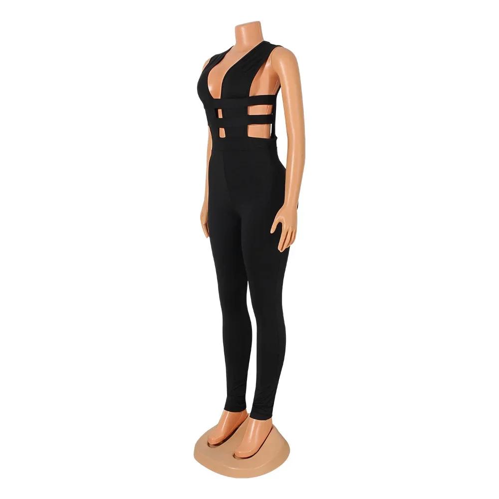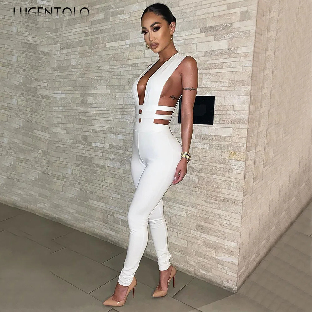 Women Sexy Jumpsuits Party Prom Nightclub V-neck Sleeveless Lady Solid Banquet Hollow New Splicing Tight Spring Summer Jumpsuit