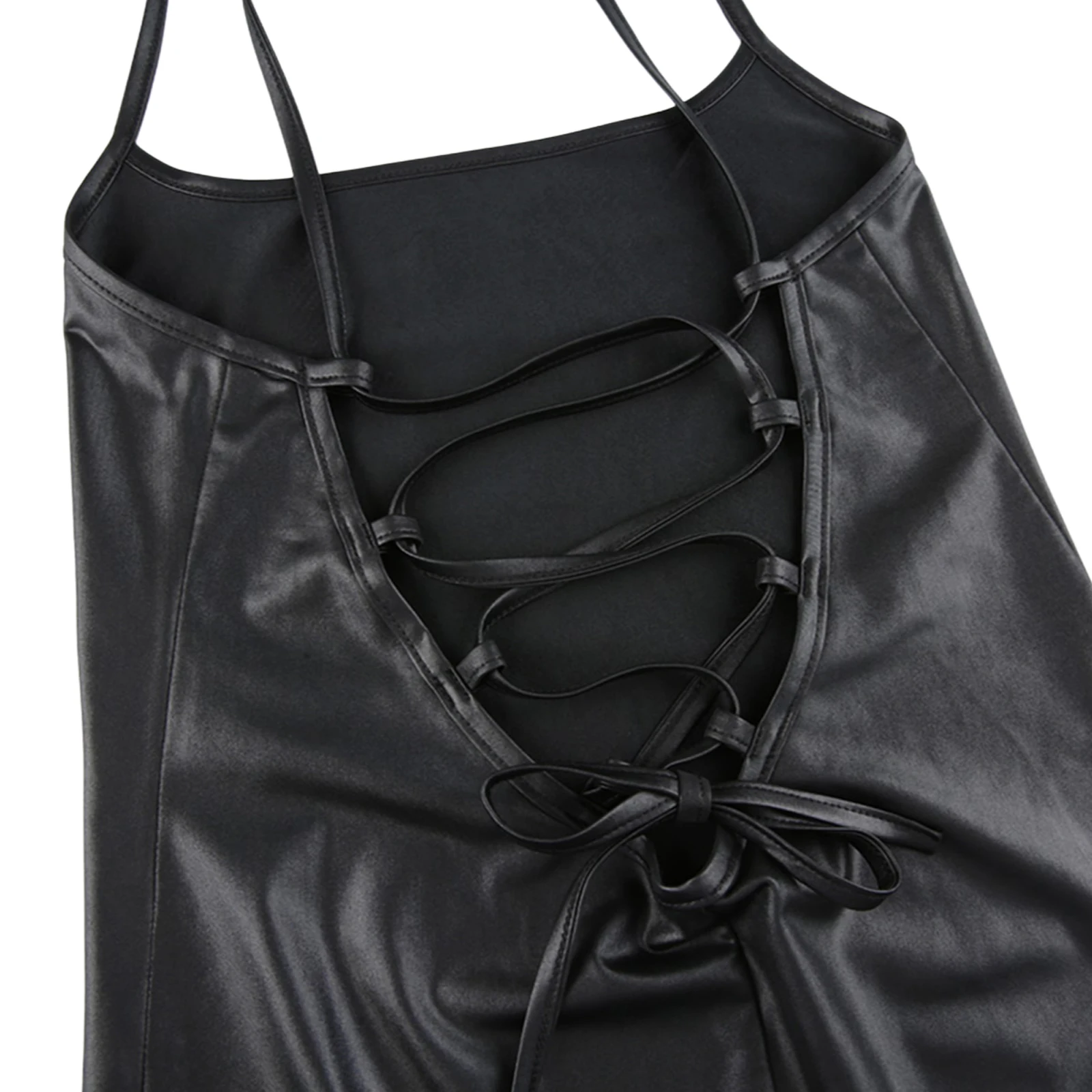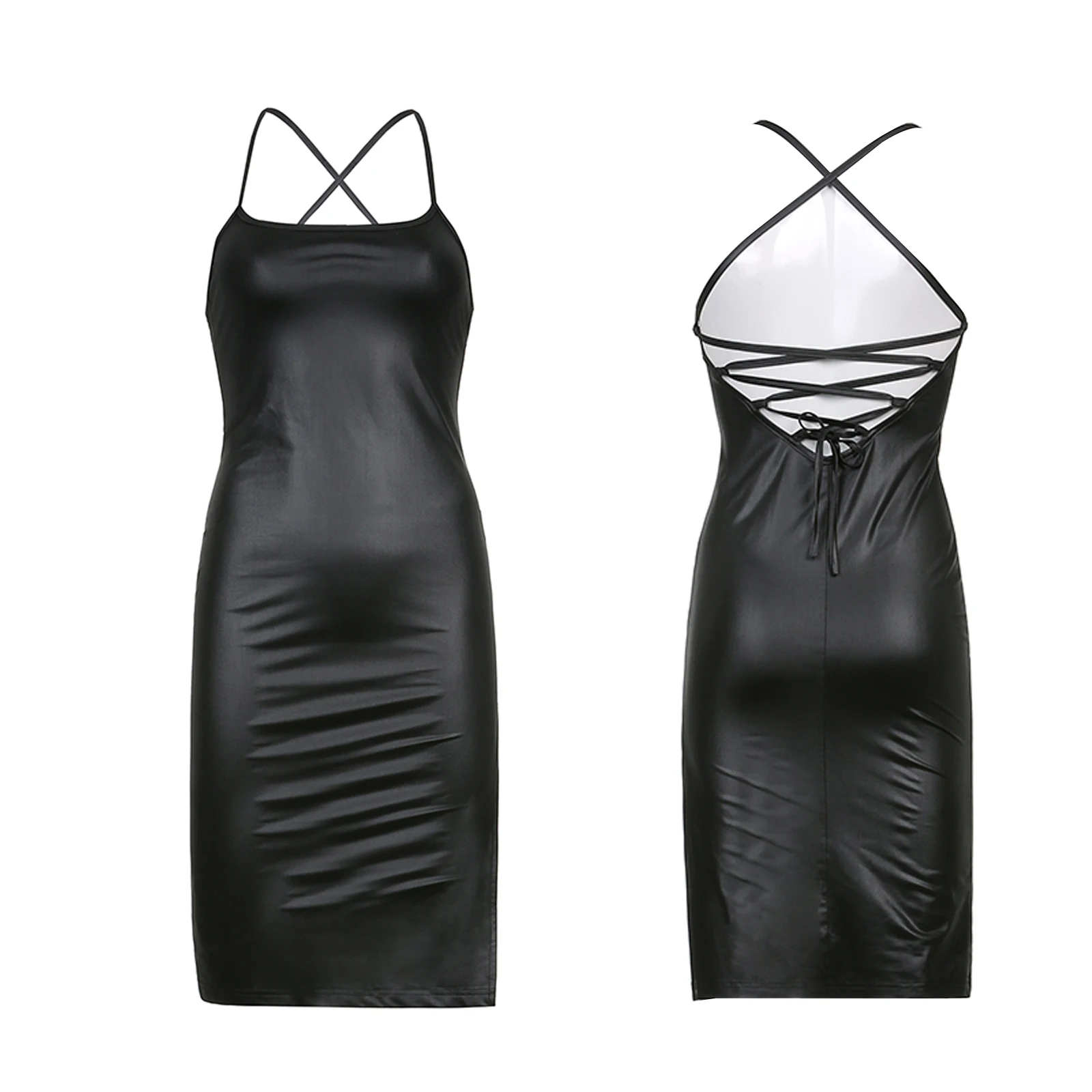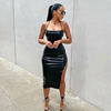 Women Sexy Suspender Mid-length Bodycon Dress Fashion Solid Color Leather Bandage Backless Skinny Split Dress For Female Mujer