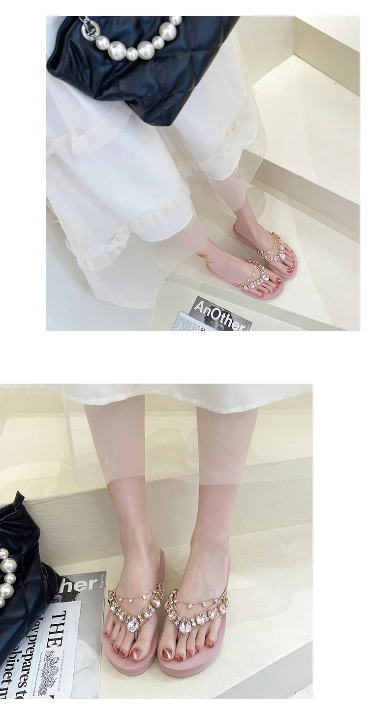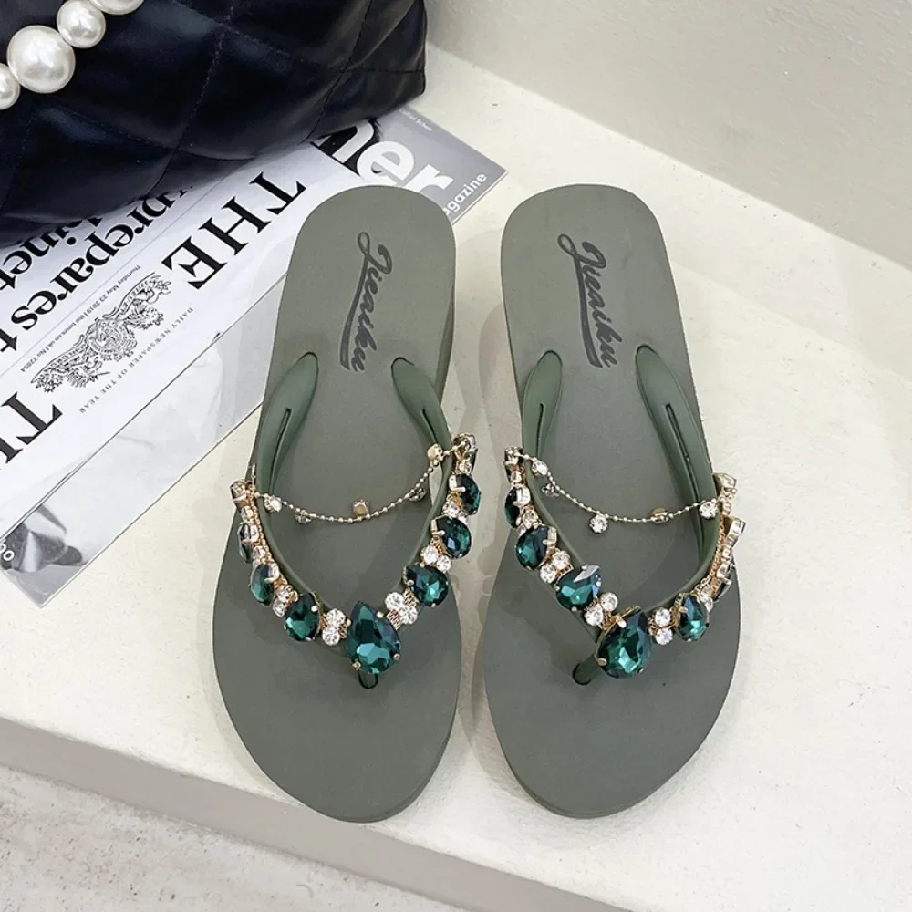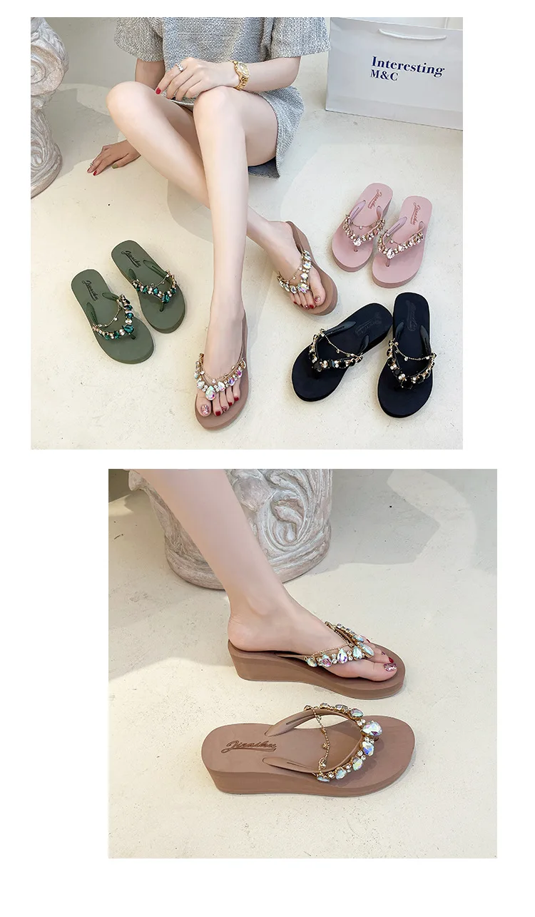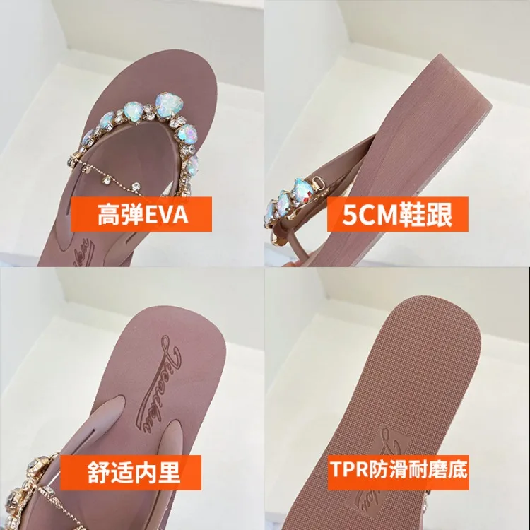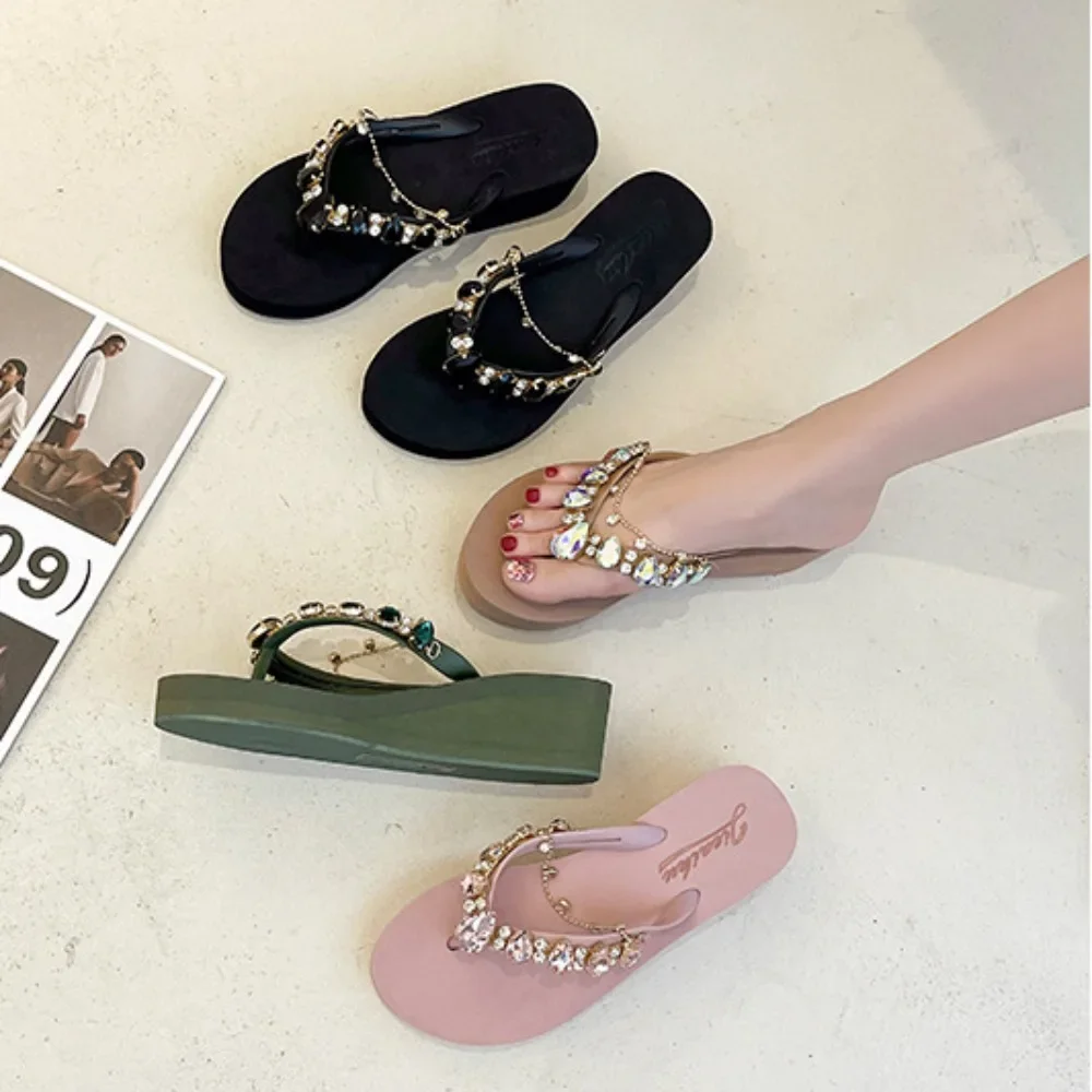 Women Slippers Fashion 2026 Summer New Water Diamond Flip Flops Women Outwear Thick Sole Slope Heels Beach Vacation Slippers