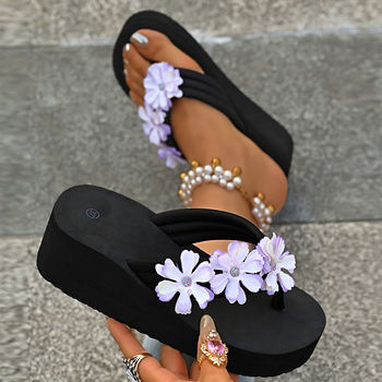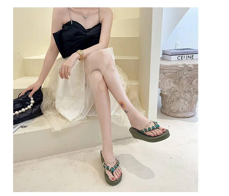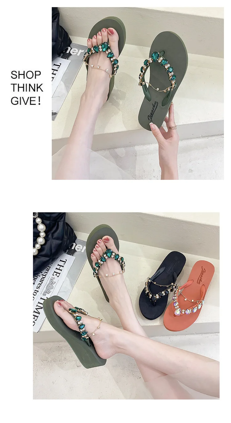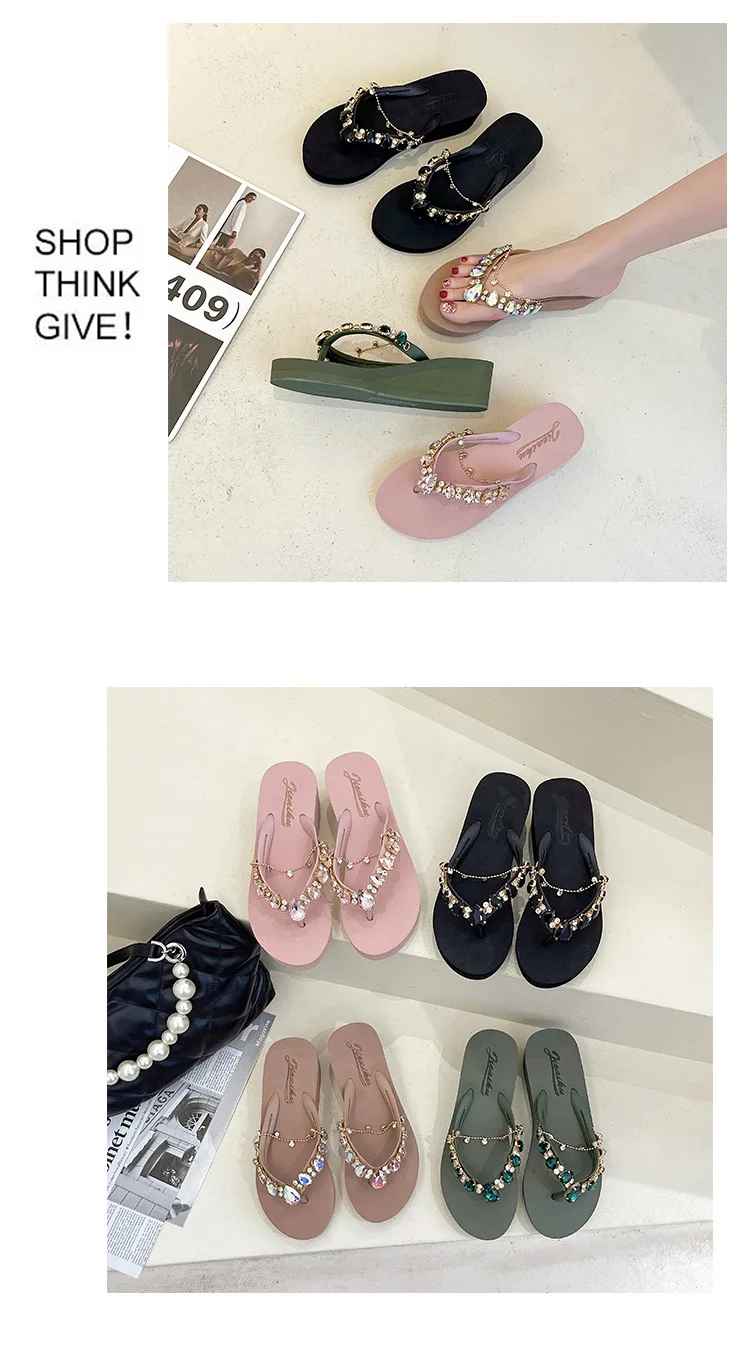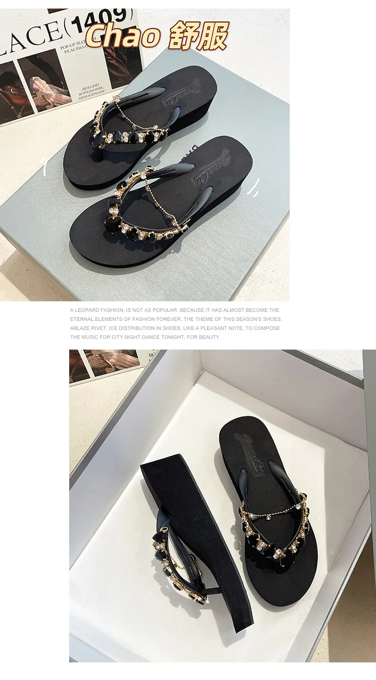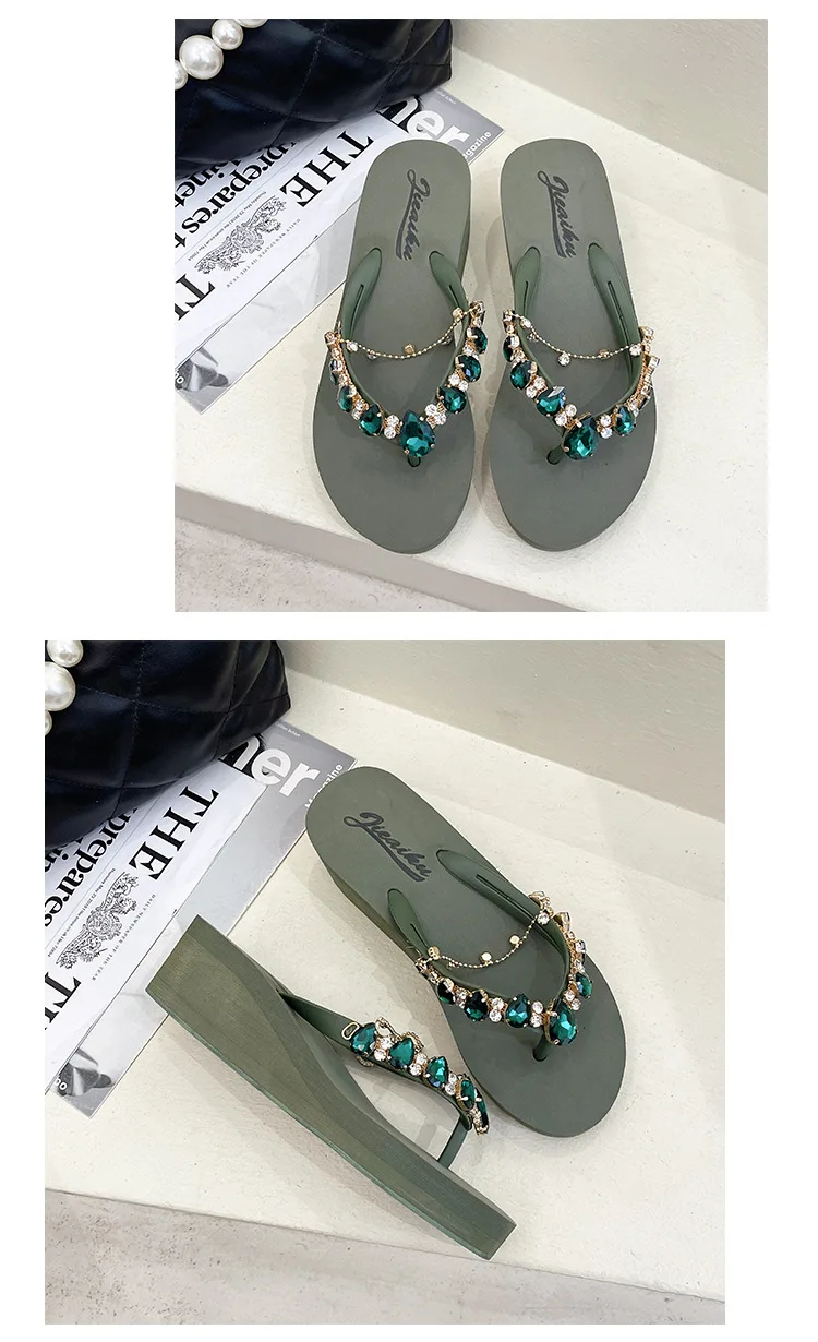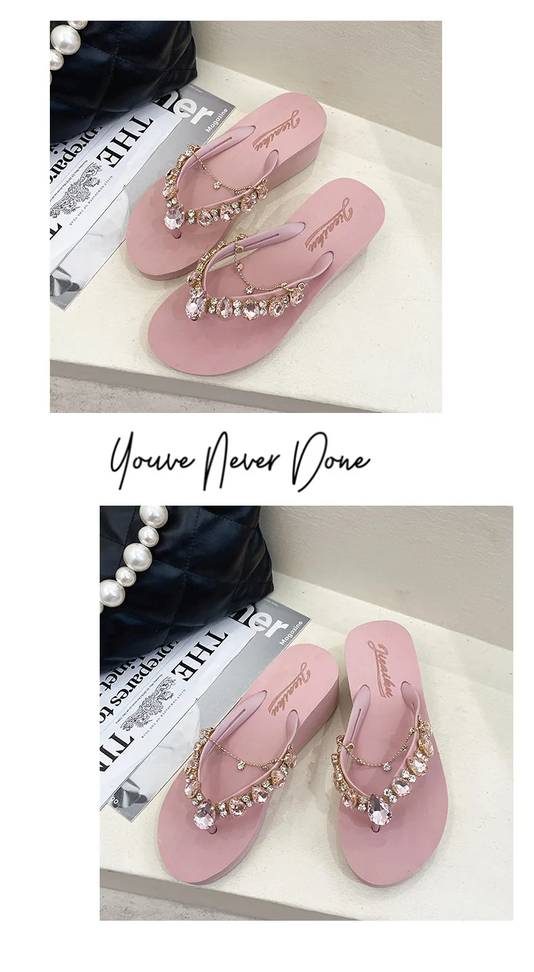 Women Slippers Fashion 2026 Summer New Water Diamond Flip Flops Women Outwear Thick Sole Slope Heels Beach Vacation Slippers