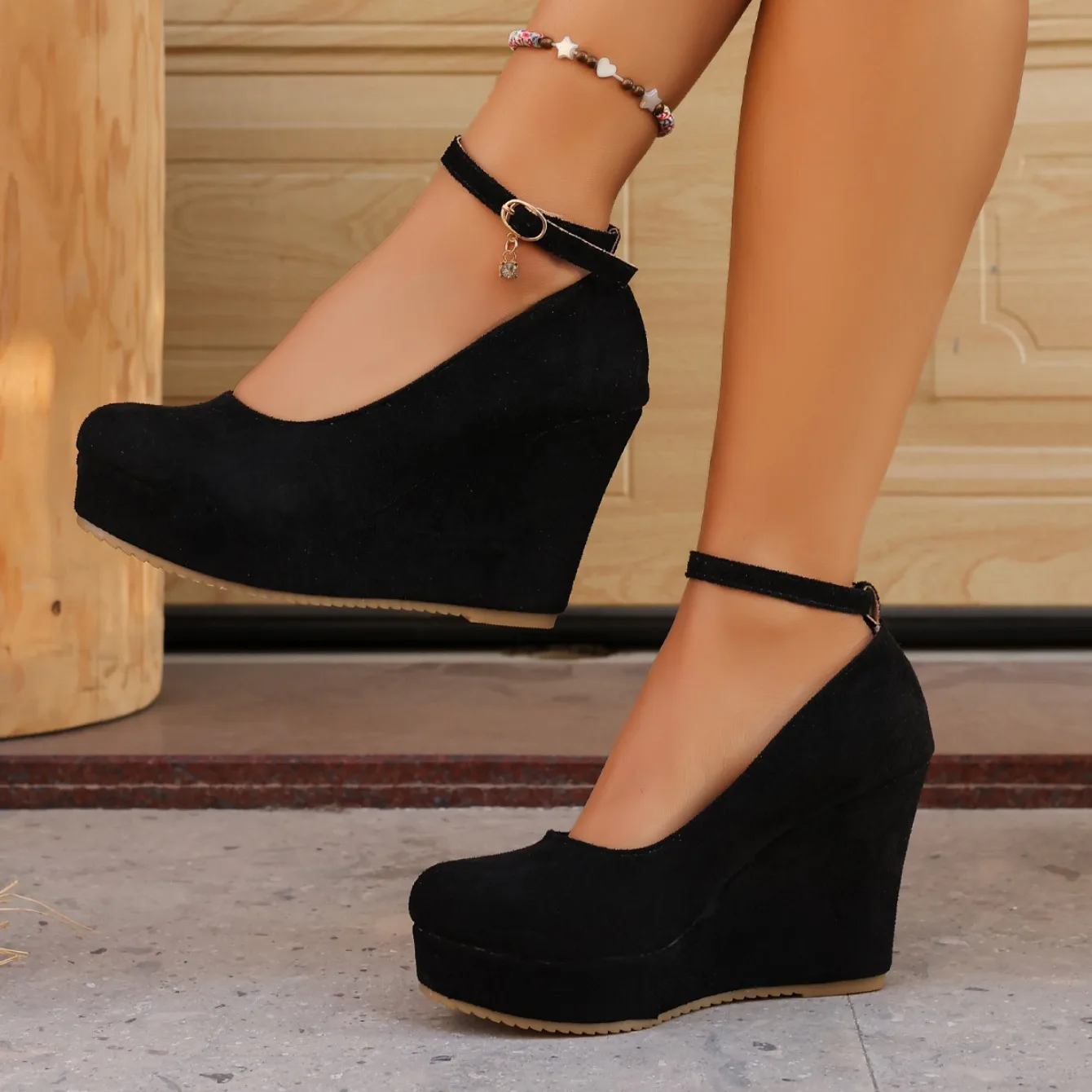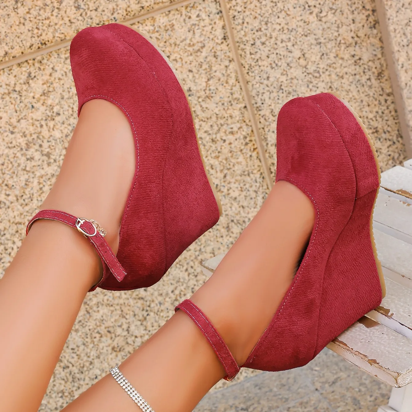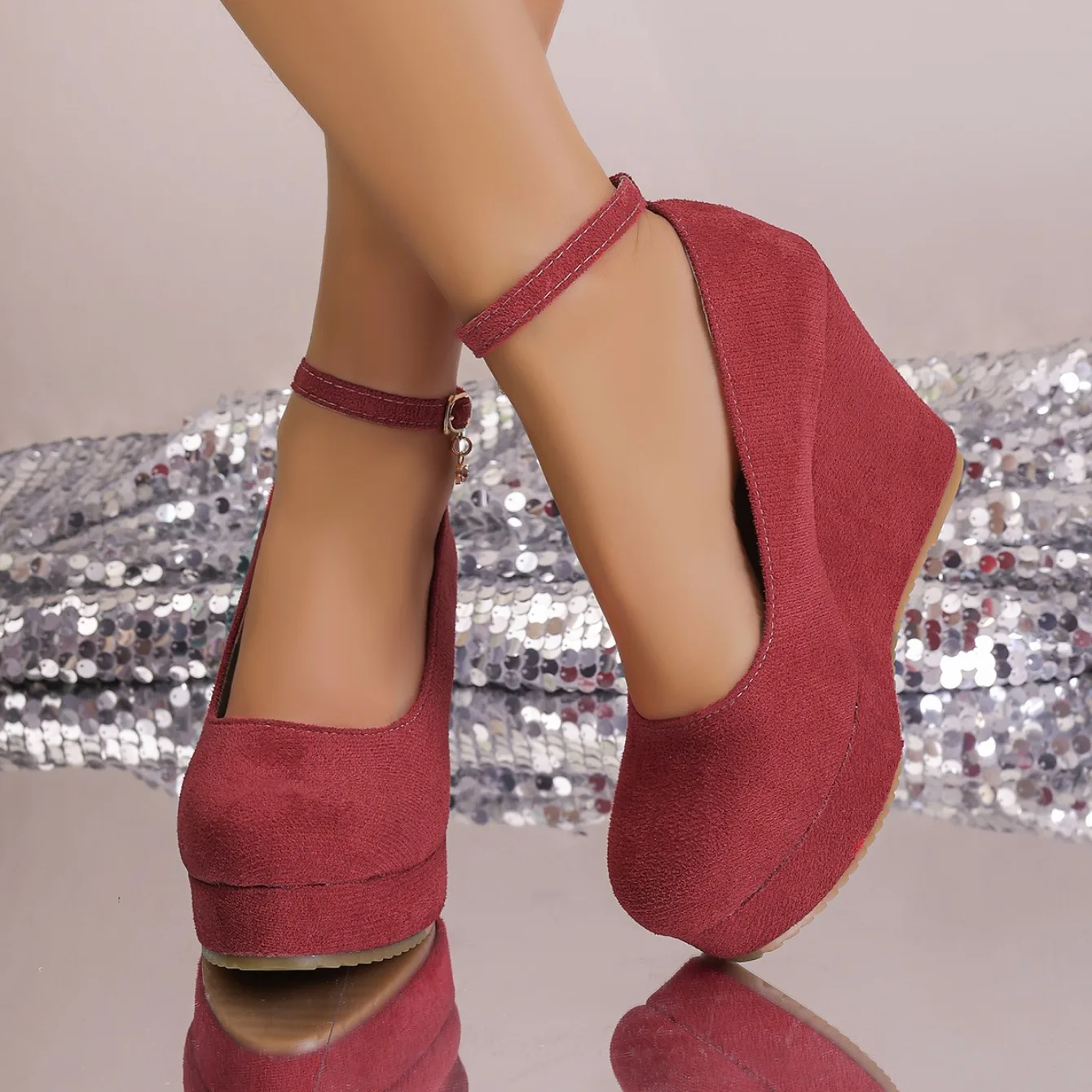 Women Wedge Pumps Sexy Buckle Round Toe Ankle Strap High Heels Shoes Platform Party Wedding Shoes Female Zapatos De Mujer