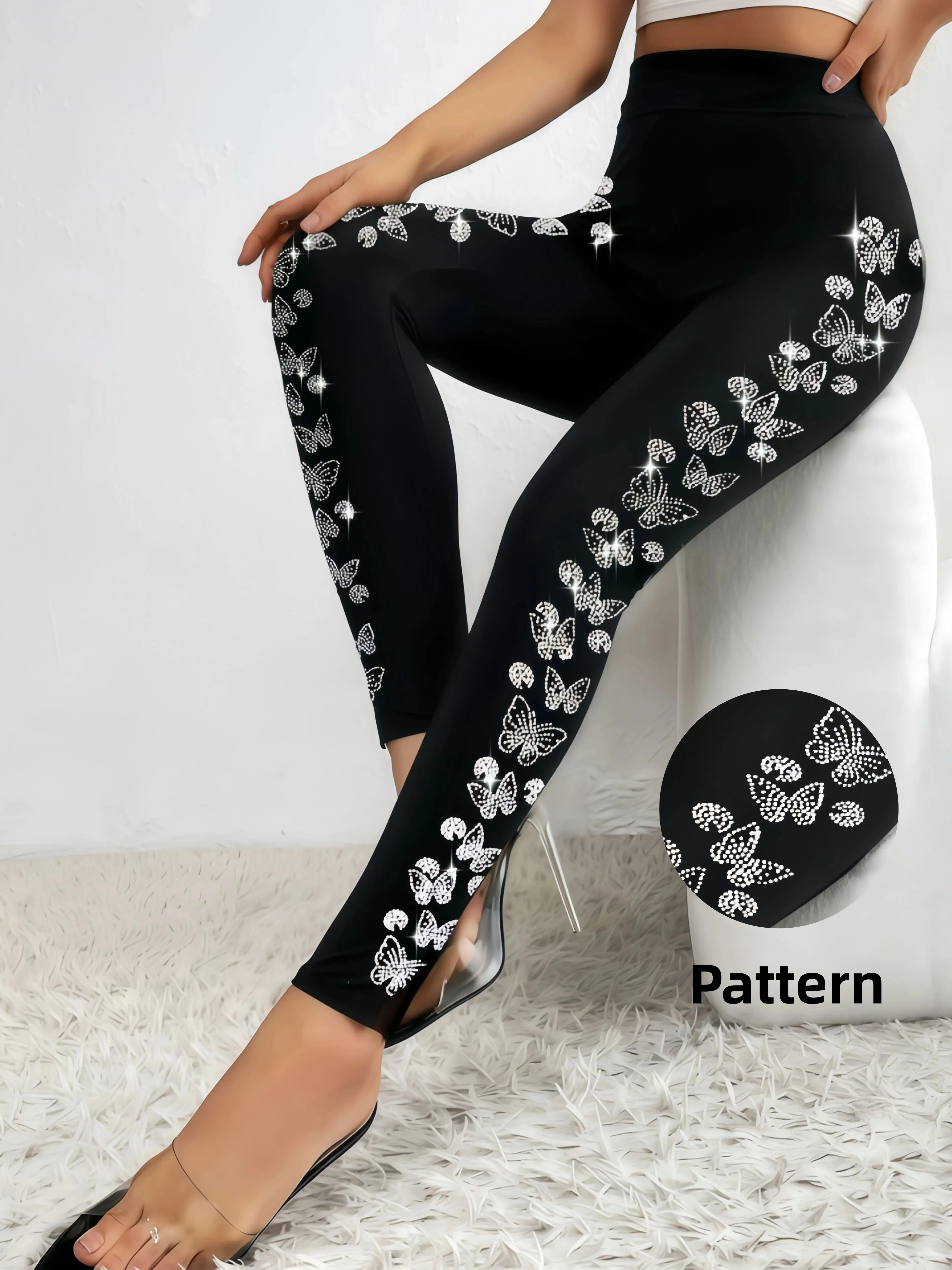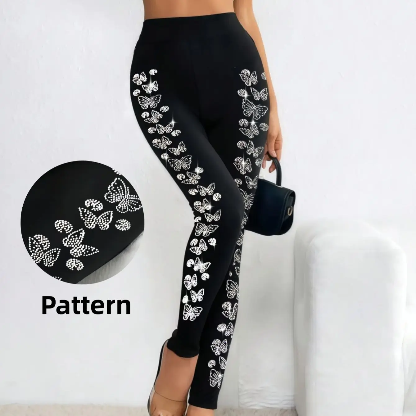 Women‘s Black Leggings with Butterfly Side Design, High Waist Sparkling Rhinestone Leggings , Stretchy Fashionable for Streetw