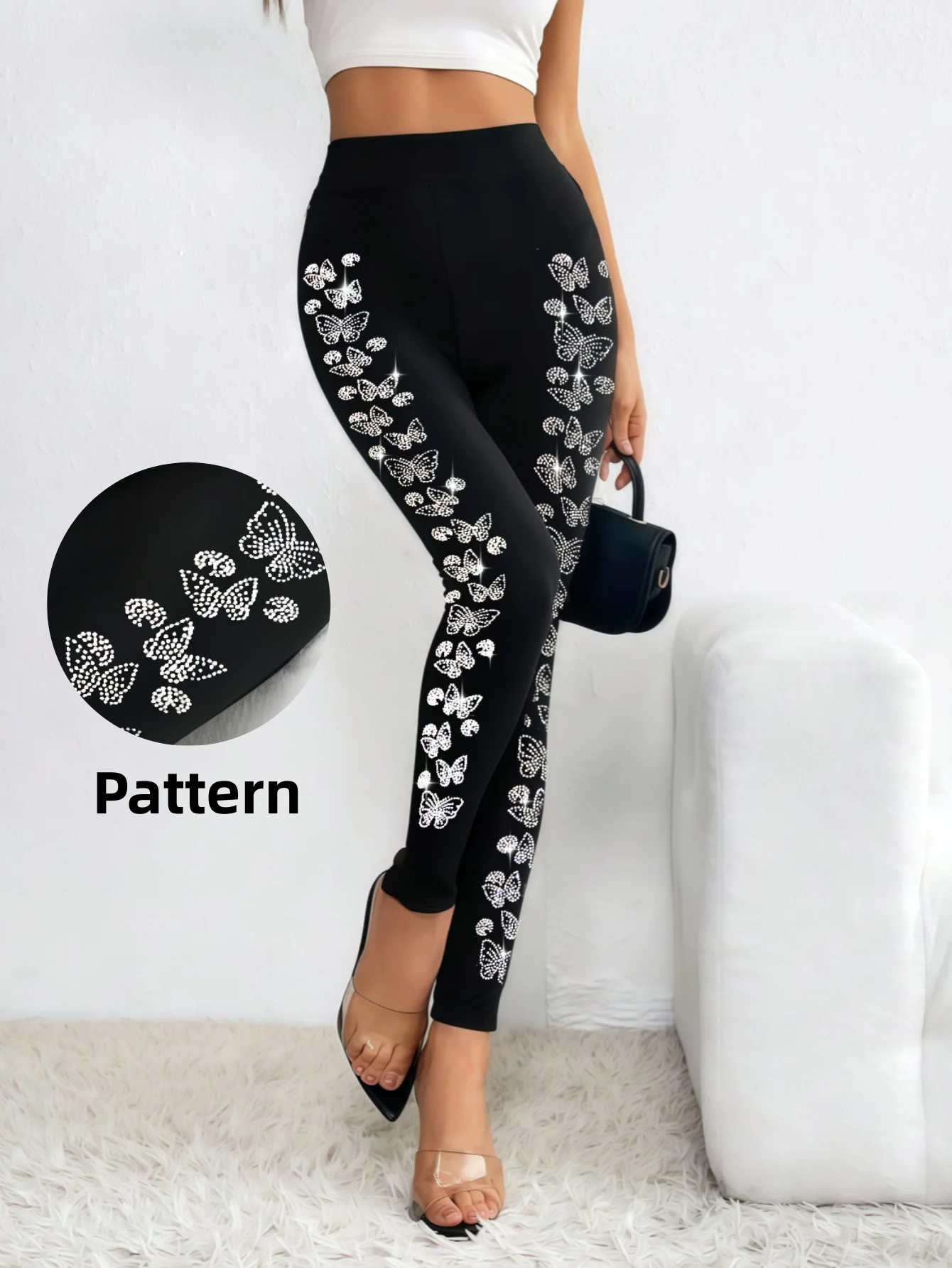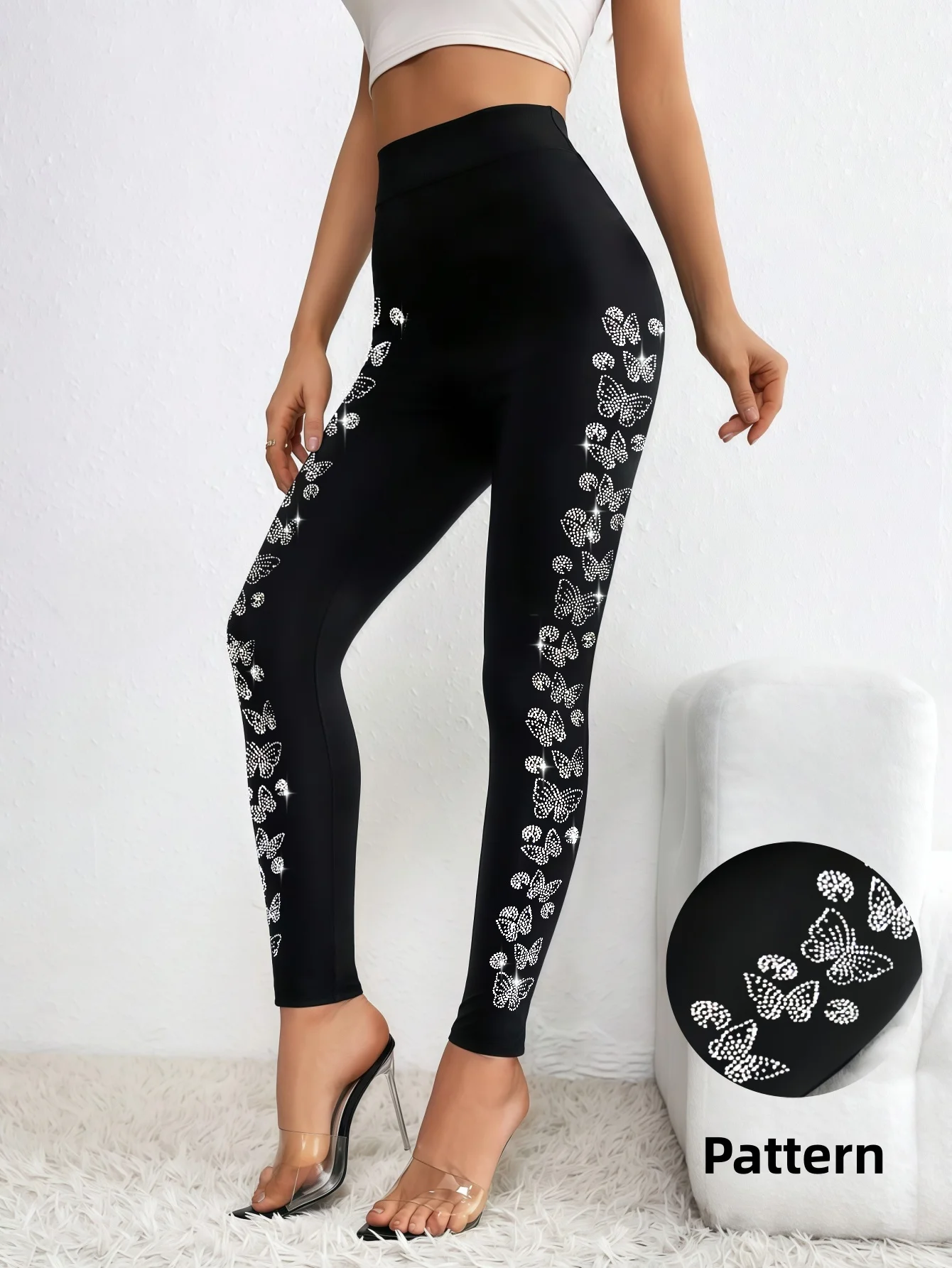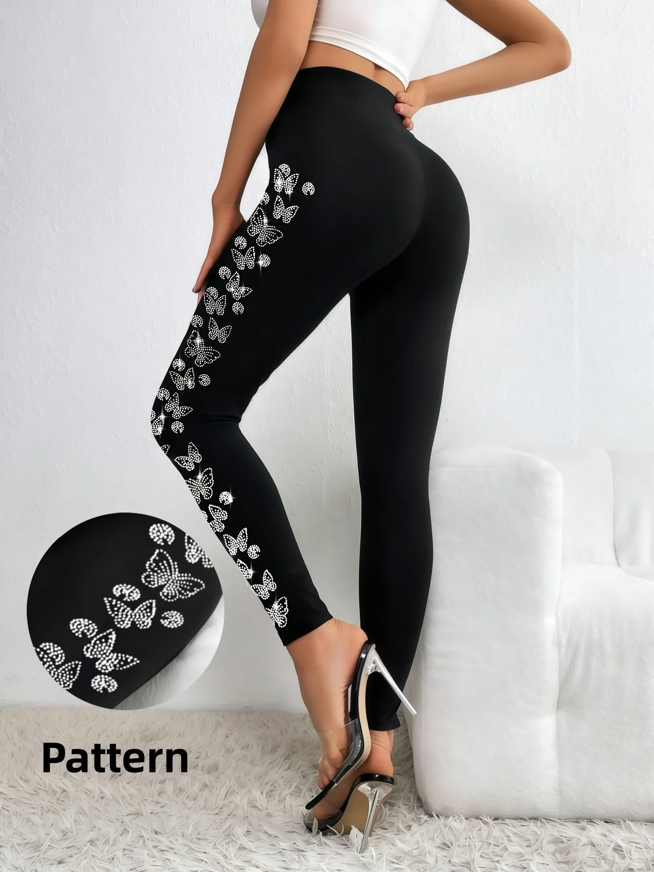 Women‘s Black Leggings with Butterfly Side Design, High Waist Sparkling Rhinestone Leggings , Stretchy Fashionable for Streetw