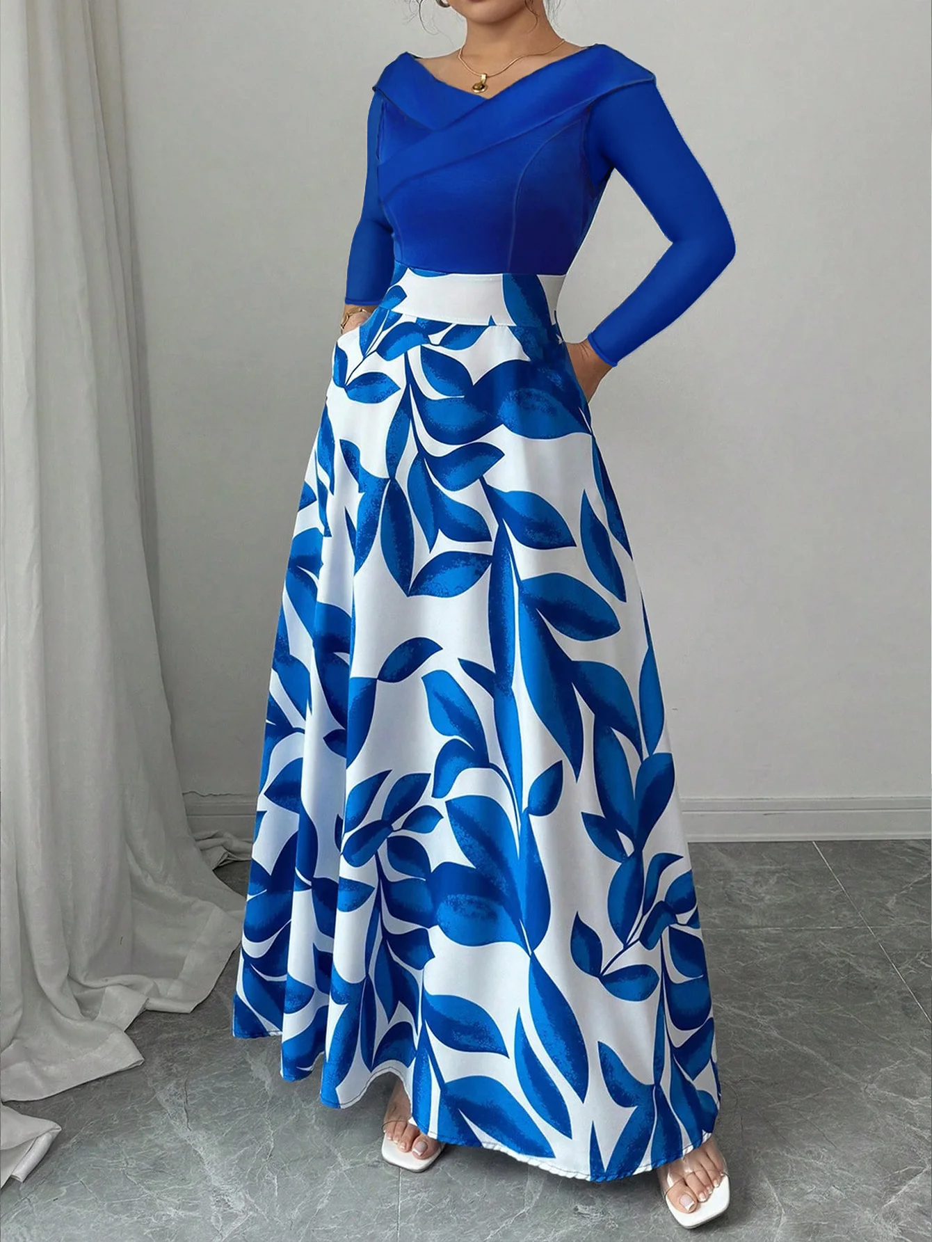 Women’s Blue White Floral Maxi Dress Asymmetric Neckline Color Block Design Ideal for Evening Events Garden Parties Elegant Styl