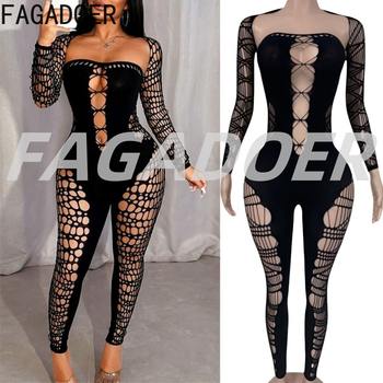 FAGADOER Sexy Hollow Out Bodycon Jumpsuit Women Solid Color See Though Long Sleeve Shawl + Rompers Female Nightclub Overalls New