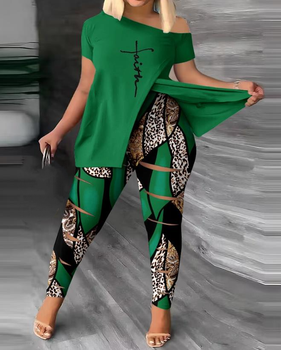 Two Piece Sets Womens Outifits 2023 Summer Fashion Faith Leopard Print Split Hem Skew Neck Short Sleeve Top & Casual Pants Set
