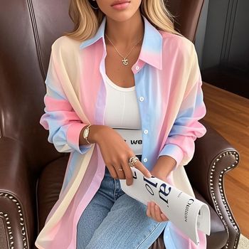See-through Irregular Gradient Rainbow Long Sleeved Shirt And Blouses Thin For Women Clothes Loose Top Pink Casual Fashion Trend