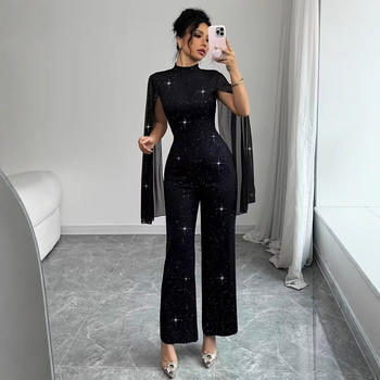 Women’s Glitter Mock Neck Sheer Chiffon Cloak Sleeve Elegant Overalls Temperament Commuting Female Casual Zipper Back Jumpsuit