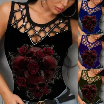 Summer New Women’s T-Shirt Camouflage Print Sleeveless Fit Fashion V-Neck Lace Sexy Fashion Casual Women’s Clothing