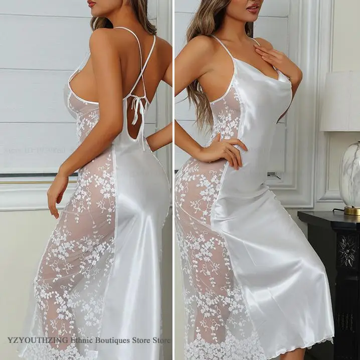 Sexy Hollow Out Long Nightgown Chemise Sleepwear Patchwork Perspective Lace Lingerie Women’s Nightdress Homewear Rayon Nightwear