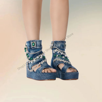 Blue Denim Crystal Chain Decor Mid Calf Sandals Boots Side Zipper Women Shoes High Top Open Toe Fashion 2024 Zapatos Para Mujere