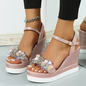 8-10cm Women’s Wedge Slippers Super High Heels Waterproof Platform Sequin Diamond Wedding Shoes Ladies Wear Outside Sandals