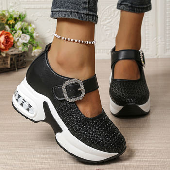 Breathable Hollow Out Casual Shoes Women 2025 Autumn Thick Bottom High Heel Mary Jane Shoes Thick Bottom Buckle Strap Sneakers