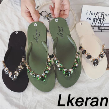 Bling Bling Rhinestones Gladiator Flat Sandals Linamong Newest T-strap Crystal Black Beige Flat Sandals Shining Beach Shoes