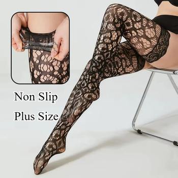 Kave Sexy Lace Fishnet Stockings Women Lace Trimmed Floral Embroidered Fishnet Over Knee Non-Slip Silicone Edge Long Tube Socks