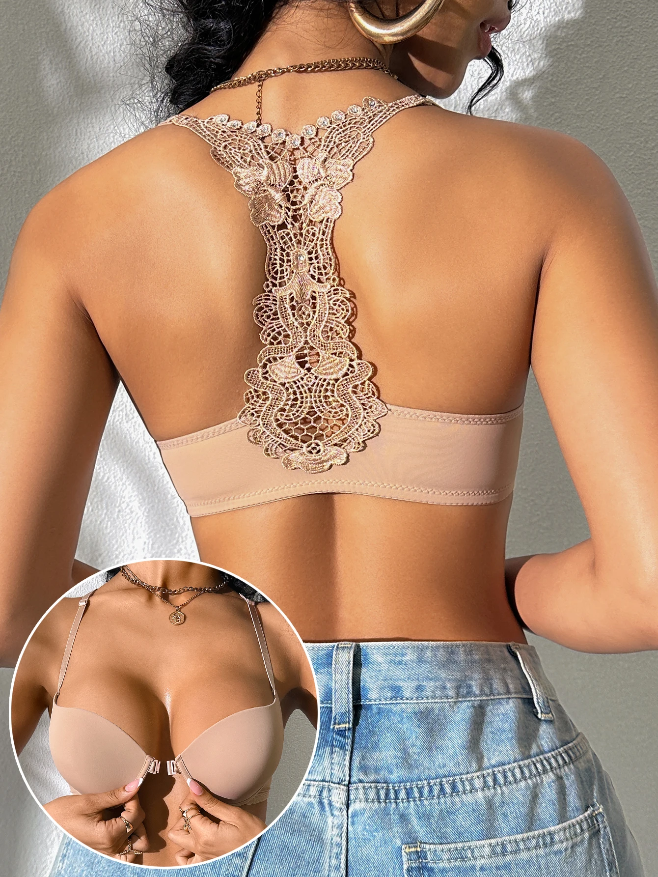 Women’s Sexy Bras Sexy Lace Splicing and Beautiful Back Design Front-Clasp Push-Up Padded Bra