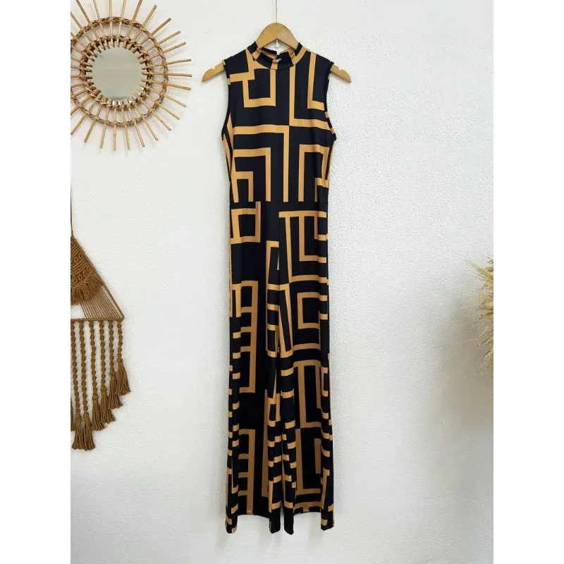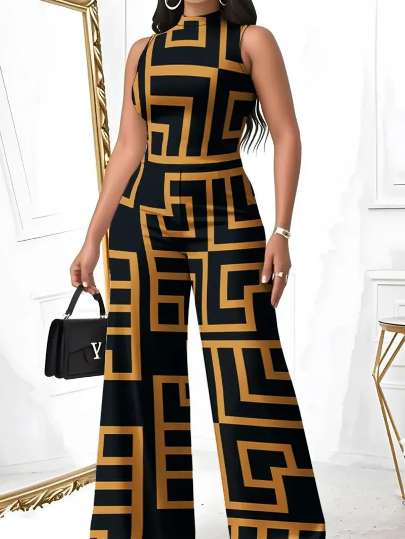 Women’s Sleeveless Color-Block Jumpsuit European American Maze Geometric Pattern Fashion Comfortable Commuterwear