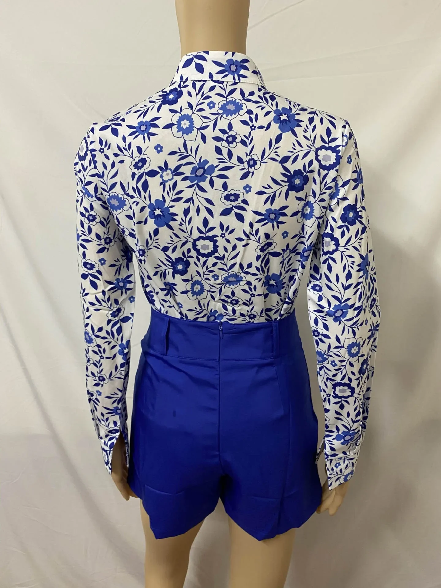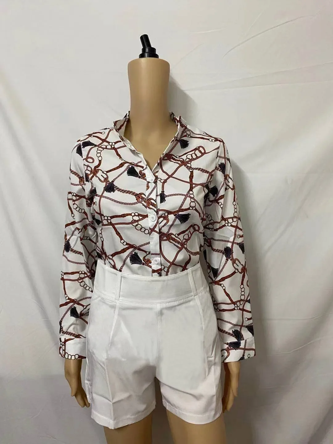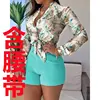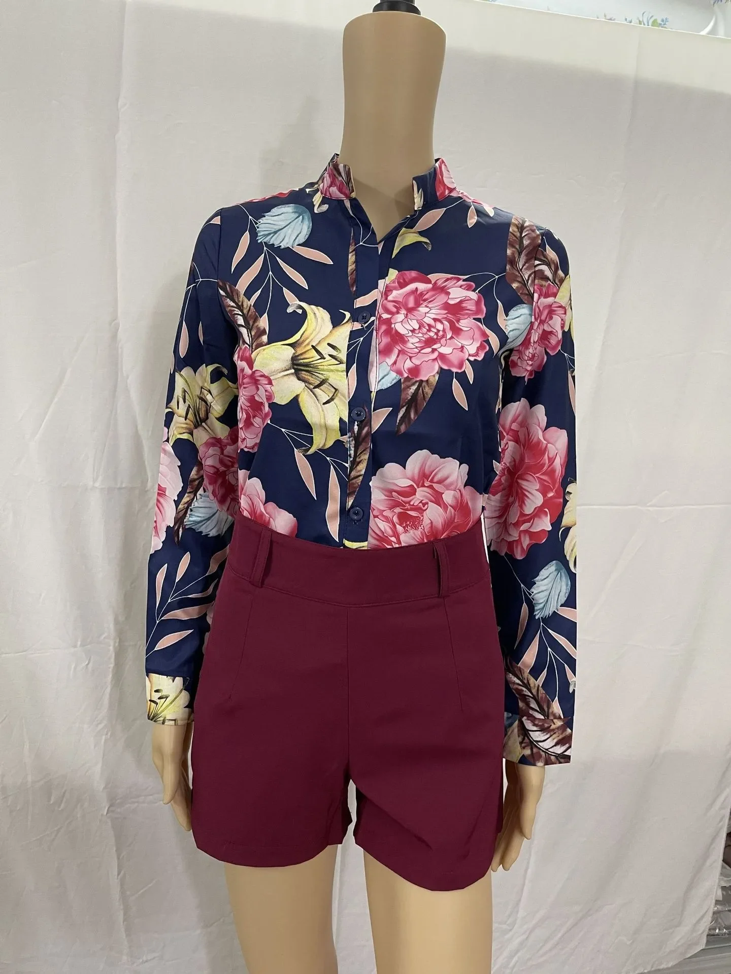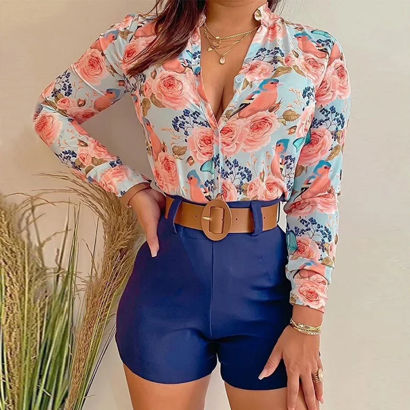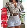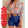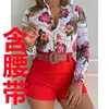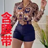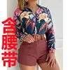 Women’s Spring New Fashion Light Mature Digital Printed Stand Collar Long Sleeve Shirt+solid Color Zipper Shorts and Brown Belt